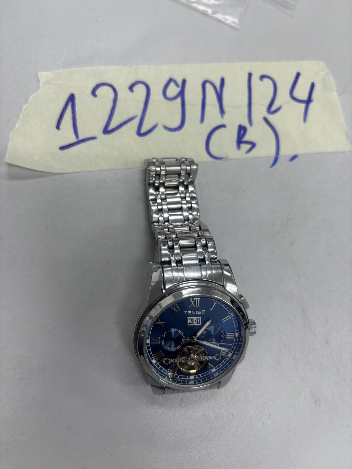 Ngày tiếp nhận: 27/7/2024 Mã hồ sơ: 1229N2024B Mô tả: 01 đồng hồ kim loại mặt màu xanh có in chữ TEVISE dây kim loại màu bạc. |