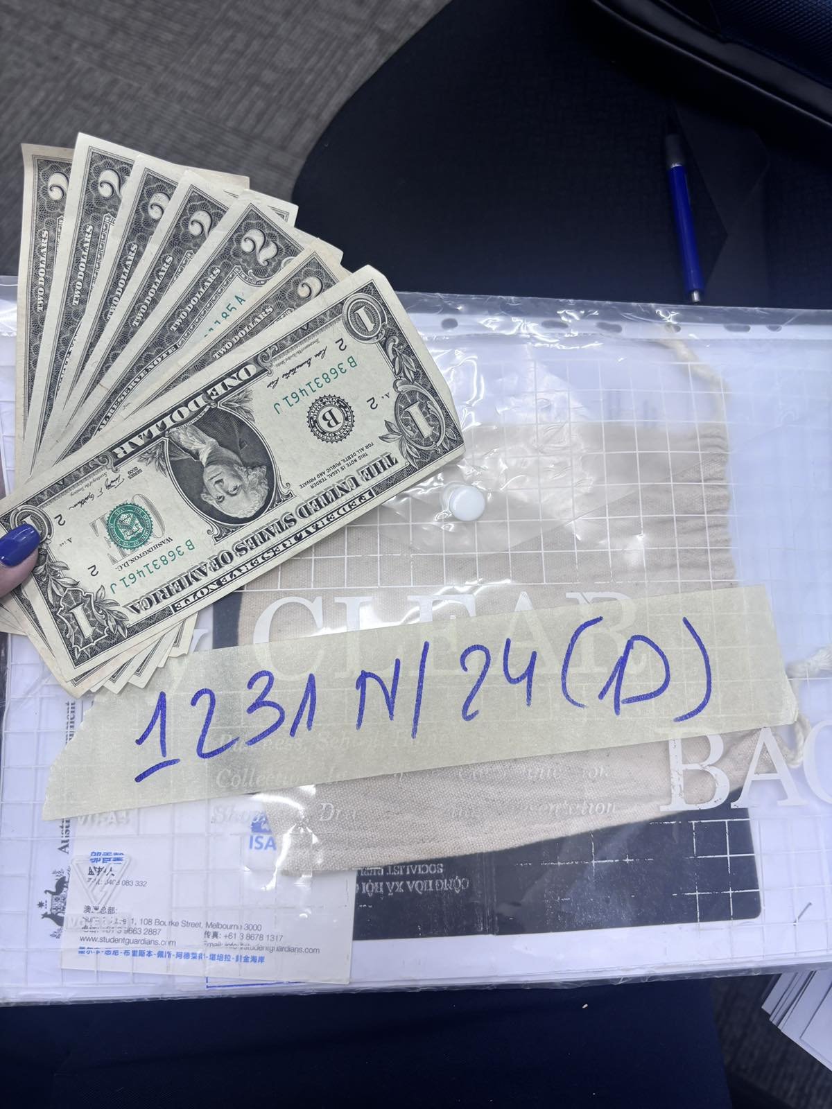Ngày tiếp nhận: 27/7/2024 Mã hồ sơ: 1231N2024D Mô tả: 01 tệp hồ sơ gồm 01 xác nhận mở thẻ của Commonwweath Bank, 01 túi vải màu nâu có chứa 13 mười ba đô la mỹ, 01 bản sao y hộ chiếu, 02 tờ xác nhân cấp visa của Úc, 02 tờ xác nhận nhập học, 01 tờ giấy xác nhận bảo hiểm y tế, 01 tờ xác nhận nơi ở Úc và một số giấy tờ khác. |