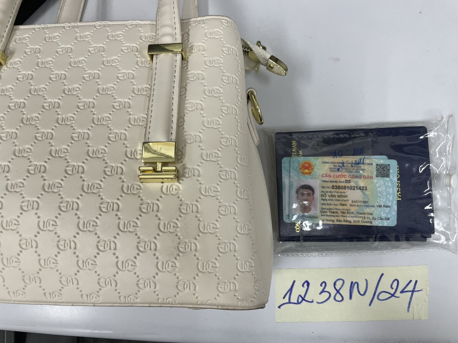 Ngày tiếp nhận: 28/7/2024 Mã hồ sơ: 1238N2024 Mô tả: 01 Túi xách nữ màu trắng bên trong có một số mỹ phẩm, 02 cccd và 03 hộ chiếu. |