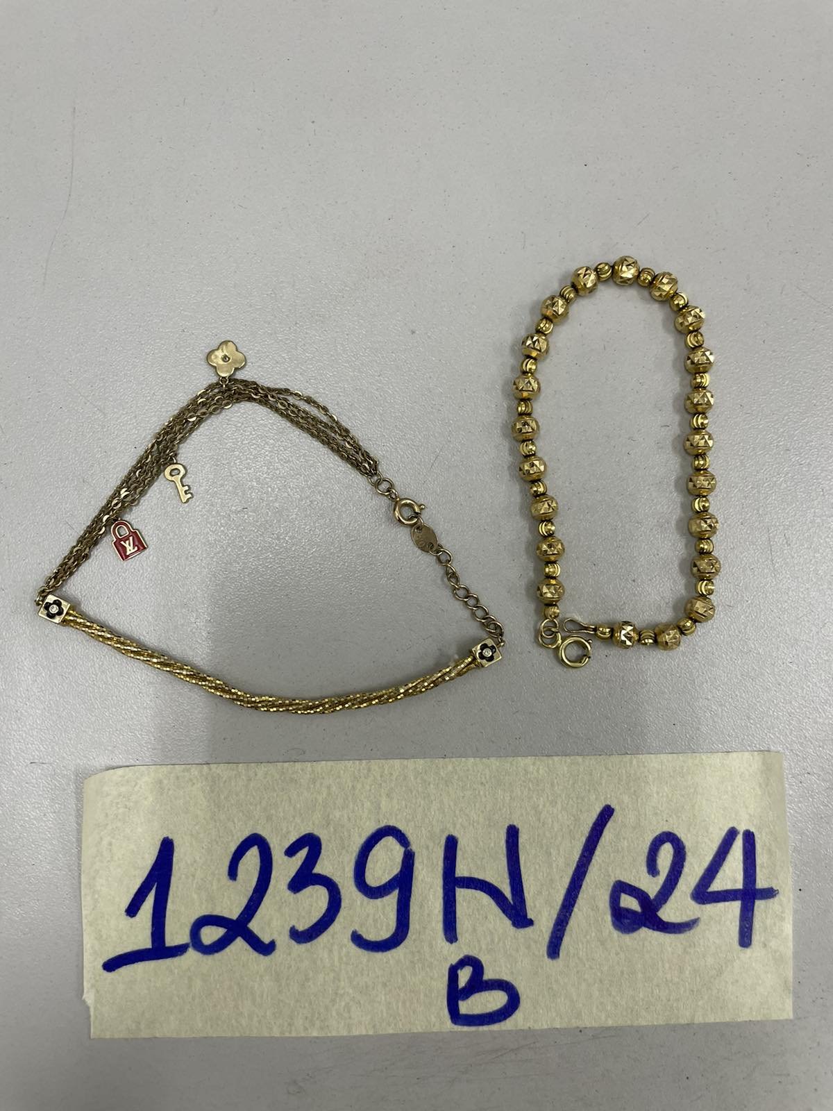 Ngày tiếp nhận: 28/7/2024 Mã hồ sơ: 1239N2024B Mô tả: 01 dây kim loại màu vàng dạng hạt, 01 dây kim loại màu vàng có đính hat hình ổ khóa. |