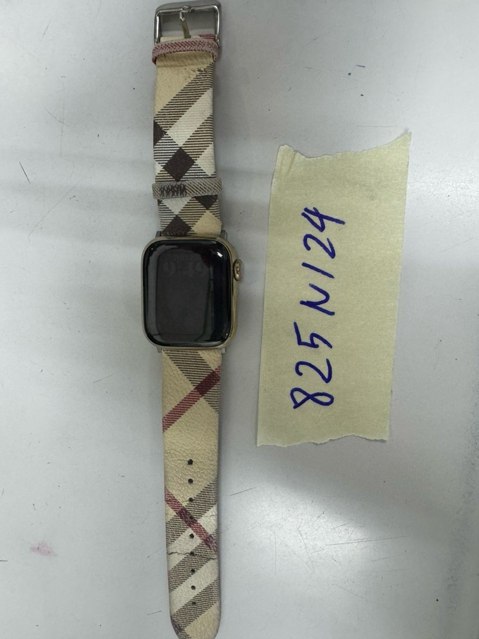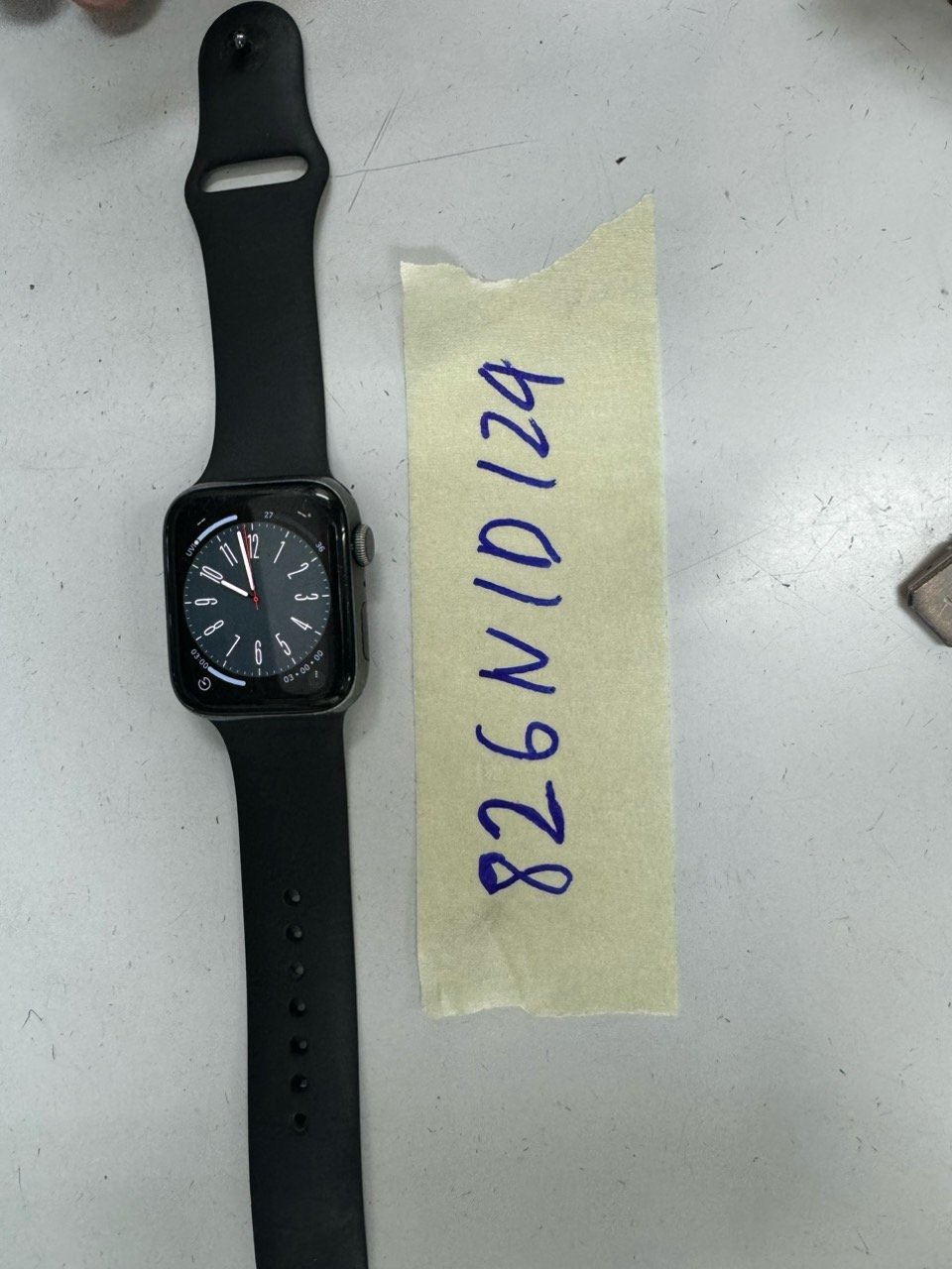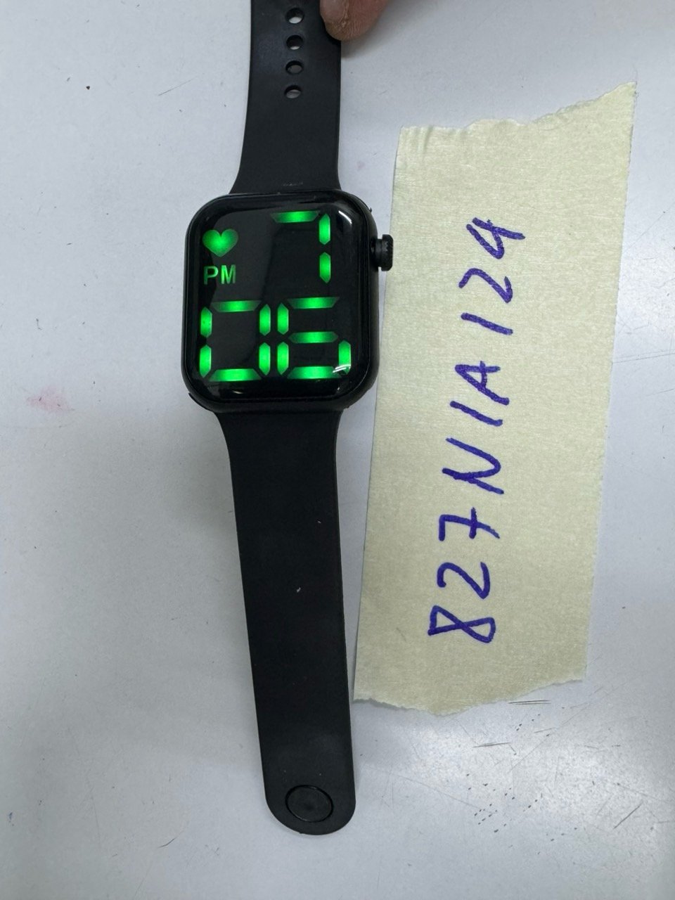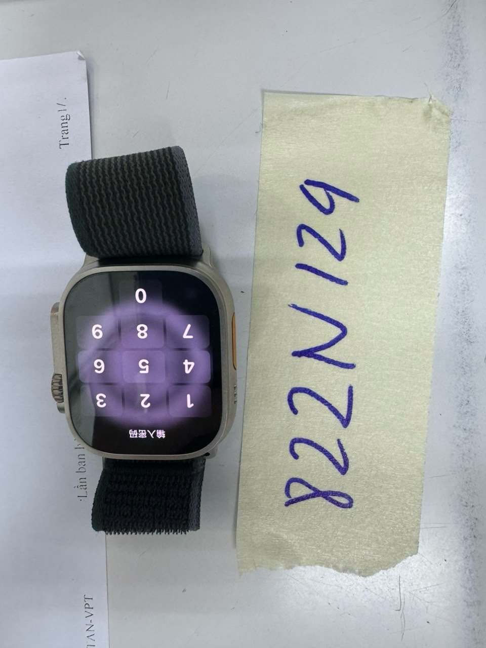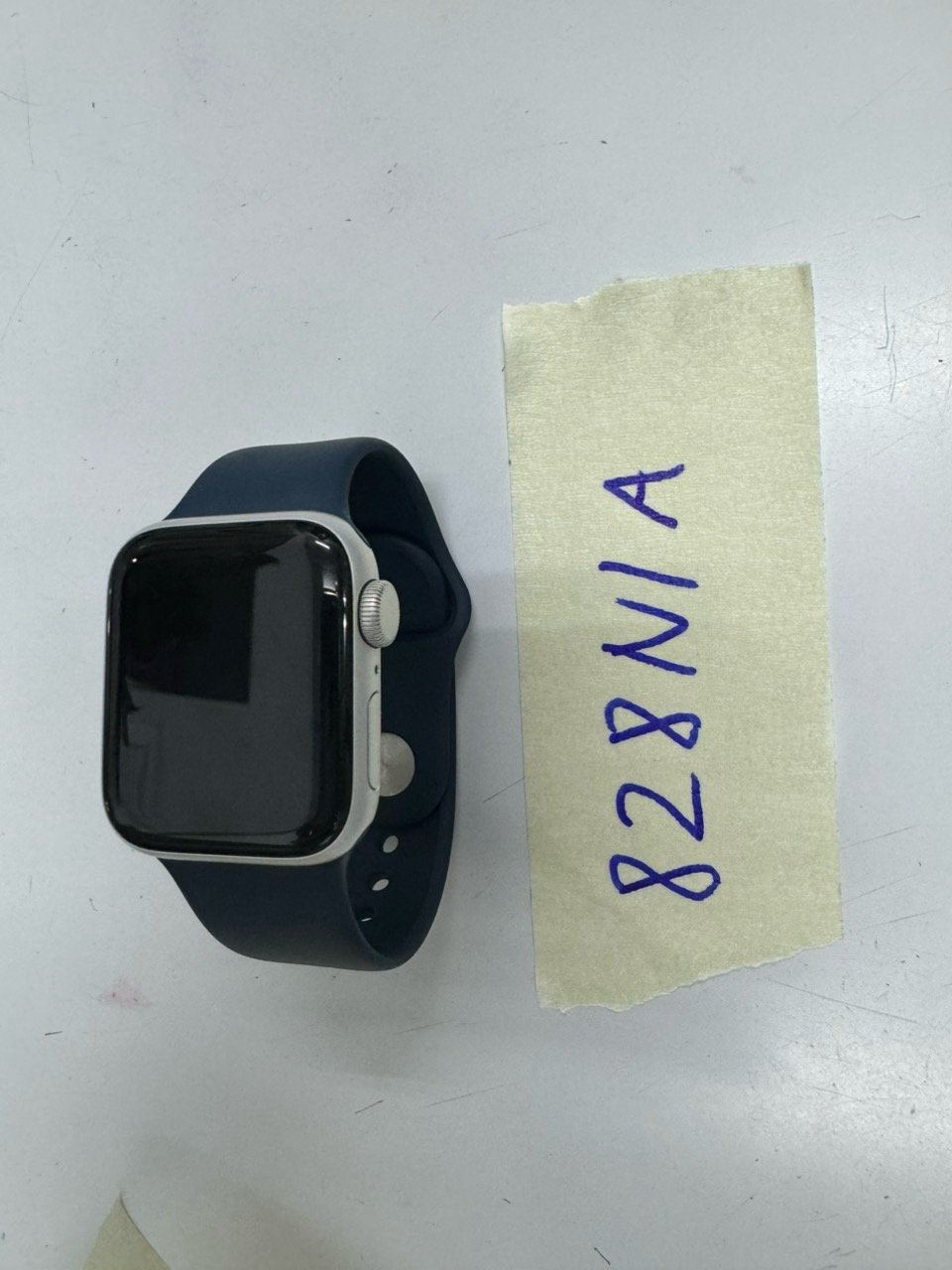 Ngày tiếp nhận: 30/5/2024 Mã hồ sơ: 828N2024A Mô tả: 01 đồng hồ dây cao su màu xanh, mặt đồng hồ có logo Apple Watch SE. |