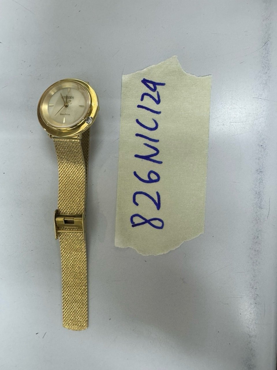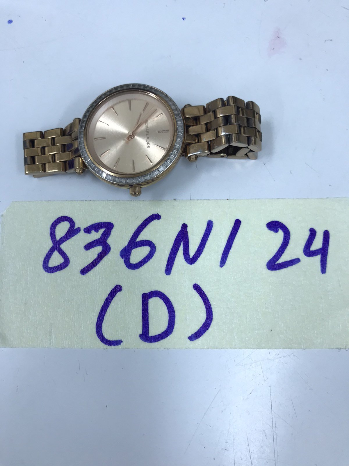 Ngày tiếp nhận: 30/5/2024 Mã hồ sơ: 836N2024D Mô tả: 01 đồng hồ kim loại màu vàng, mặt hình tròn có đính hạt và có chữ "MICHAEL KORS". |