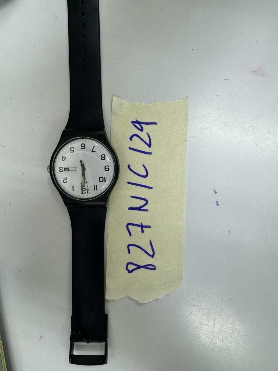 Ngày tiếp nhận: 30/5/2024 Mã hồ sơ: 827N2024C Mô tả: 01 đồng hồ SWATCH mặt tròn dây nhựa màu đen. |