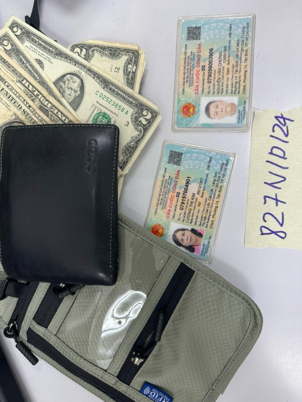 Ngày tiếp nhận: 30/5/2024 Mã hồ sơ: 827N2024D Mô tả: 01 túi đeo màu xám bên trong có 01 bóp da màu đen logo có chữ GOZID, bên trong bóp có 10 đô la (4 tờ 2 đô, 2 tờ 1 đô), 01 CCCD: NGUYỄN VĂN CHỪNG và 01 CCCD: LƯƠNG THỊ KIM. |