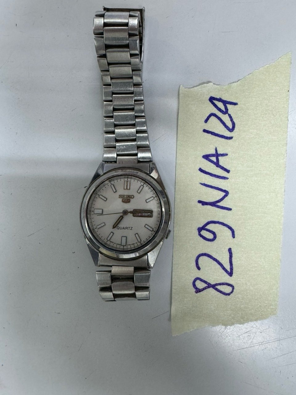 Ngày tiếp nhận: 30/5/2024 Mã hồ sơ: 829N2024A Mô tả: 01 đồng hồ kim loại mặt đồng hồ màu trắng có chữ SEIKO QUATZ dây bằng kim loại. |