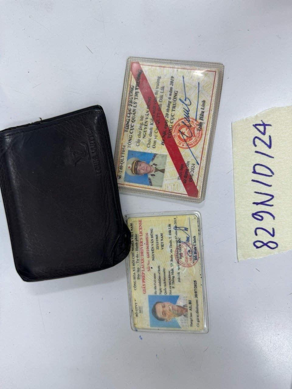 Ngày tiếp nhận: 30/5/2024 Mã hồ sơ: 829N2024D Mô tả: 01 bóp da màu nâu bên trong có 01 giấy phép lái xe hạng A1, B2 mang tên NGUYỄN VĂN DŨNG, 01 thẻ nghành của Tổng cục Quản lý thị trường mang tên NGUYỄN VĂN DŨNG. |