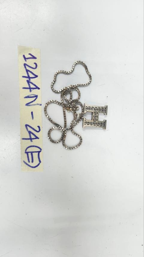 Ngày tiếp nhận: 29/7/2024 Mã hồ sơ: 1244N2024E Mô tả: 01 dây chuyền kim loại màu bạc, có mặt dây chuyền hình "H" bằng kim loại màu bạc có đính đá. |