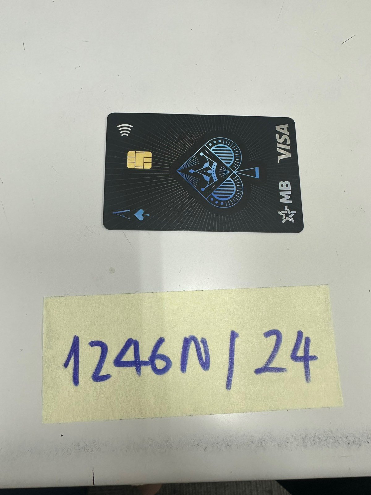 Ngày tiếp nhận: 30/7/2024 Mã hồ sơ: 1246N2024 Mô tả: 01 Thẻ nhựa màu đen có chữ MB Visa. |