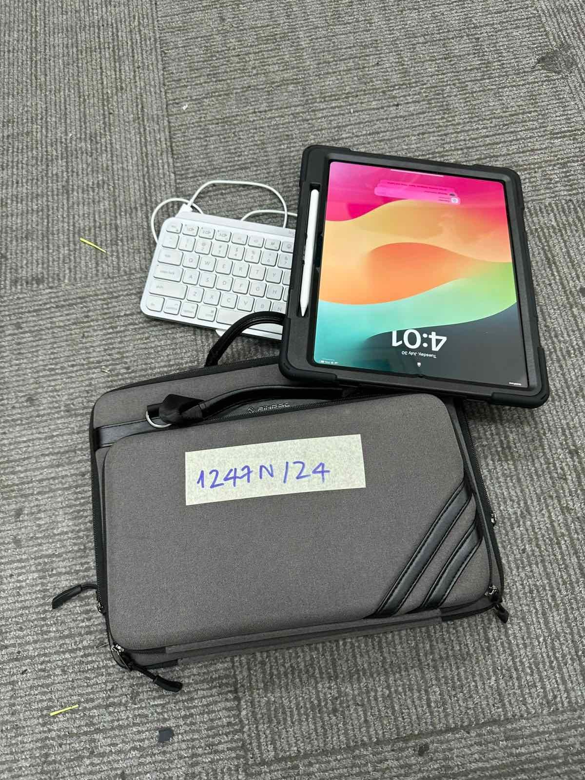 Ngày tiếp nhận: 30/7/2024 Mã hồ sơ: 1247N2024 Mô tả: 01 túi chống sốc màu xám bên trong có 01 Ipad màu xám đen, 01 bàn phím màu trắng có chữ Logi, dây sạc. |