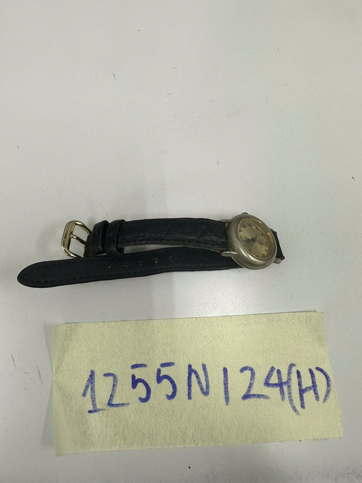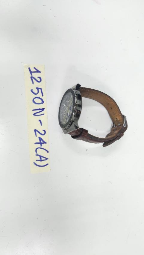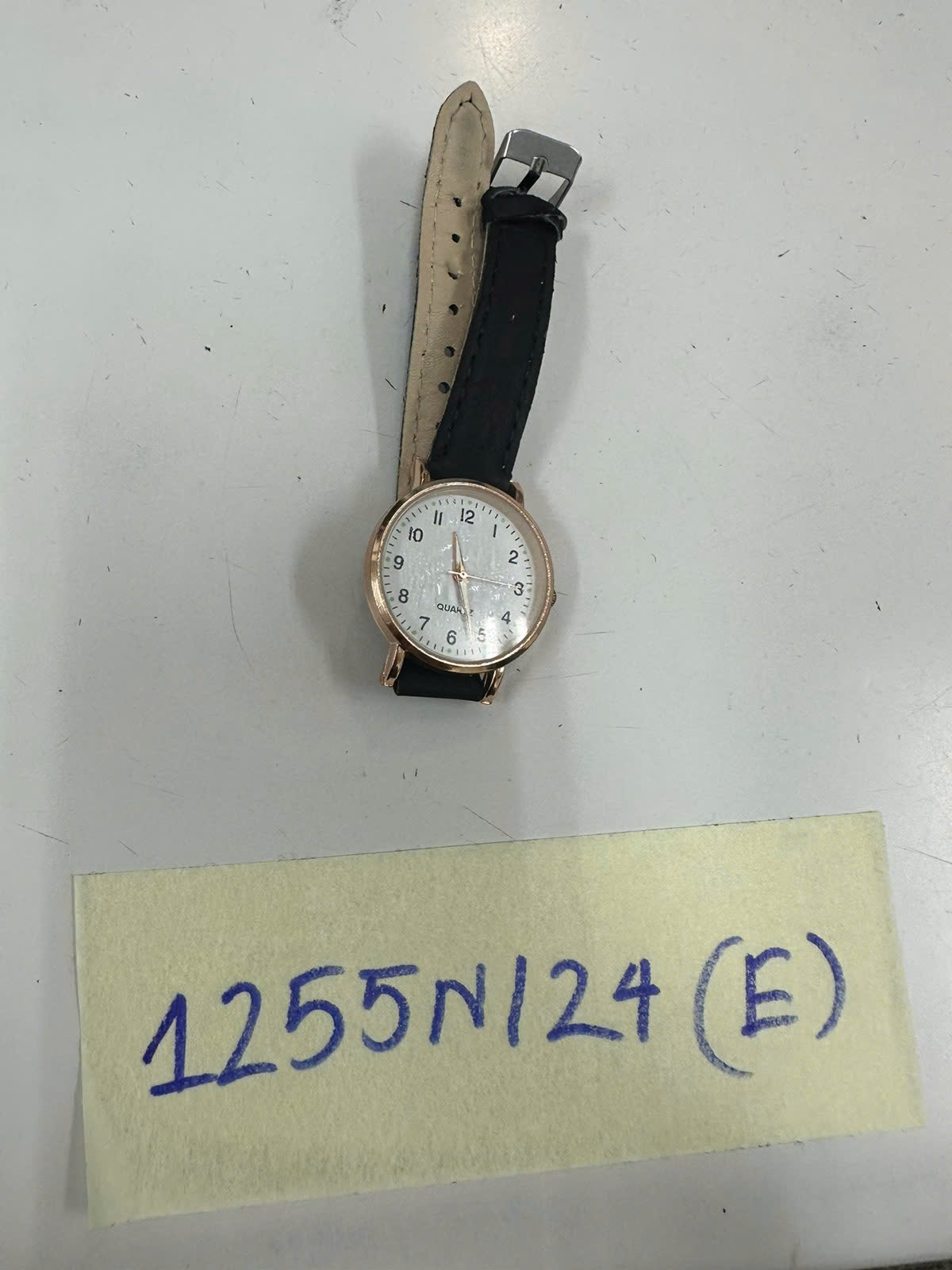 Ngày tiếp nhận: 31/7/2024 Mã hồ sơ: 1255N2024E Mô tả: 01 đồng hồ mặt tròn dây da màu đen, trên mặt đồng hồ có chữ "QUARTZ". |