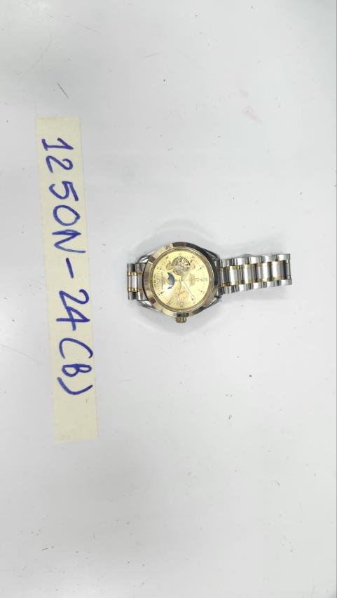 Ngày tiếp nhận: 30/7/2024 Mã hồ sơ: 1250N2024B Mô tả: 01 đồng hồ mặt màu vàng, dây đeo bằng kim loại màu trắng, có logo "OMEGA SEAMASTER PROFESSIONAL". |