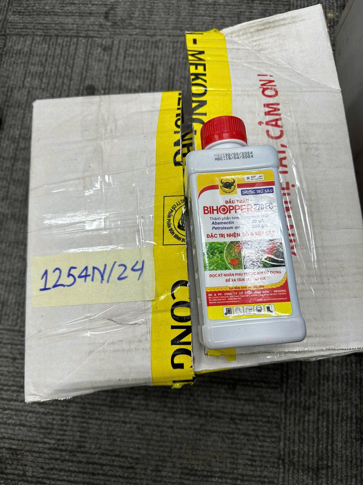 Ngày tiếp nhận: 31/7/2024 Mã hồ sơ: 1254N2024 Mô tả: 01 thùng cartoon bên trong có 10 chai nhựa trắng thuốc trừ sâu. |