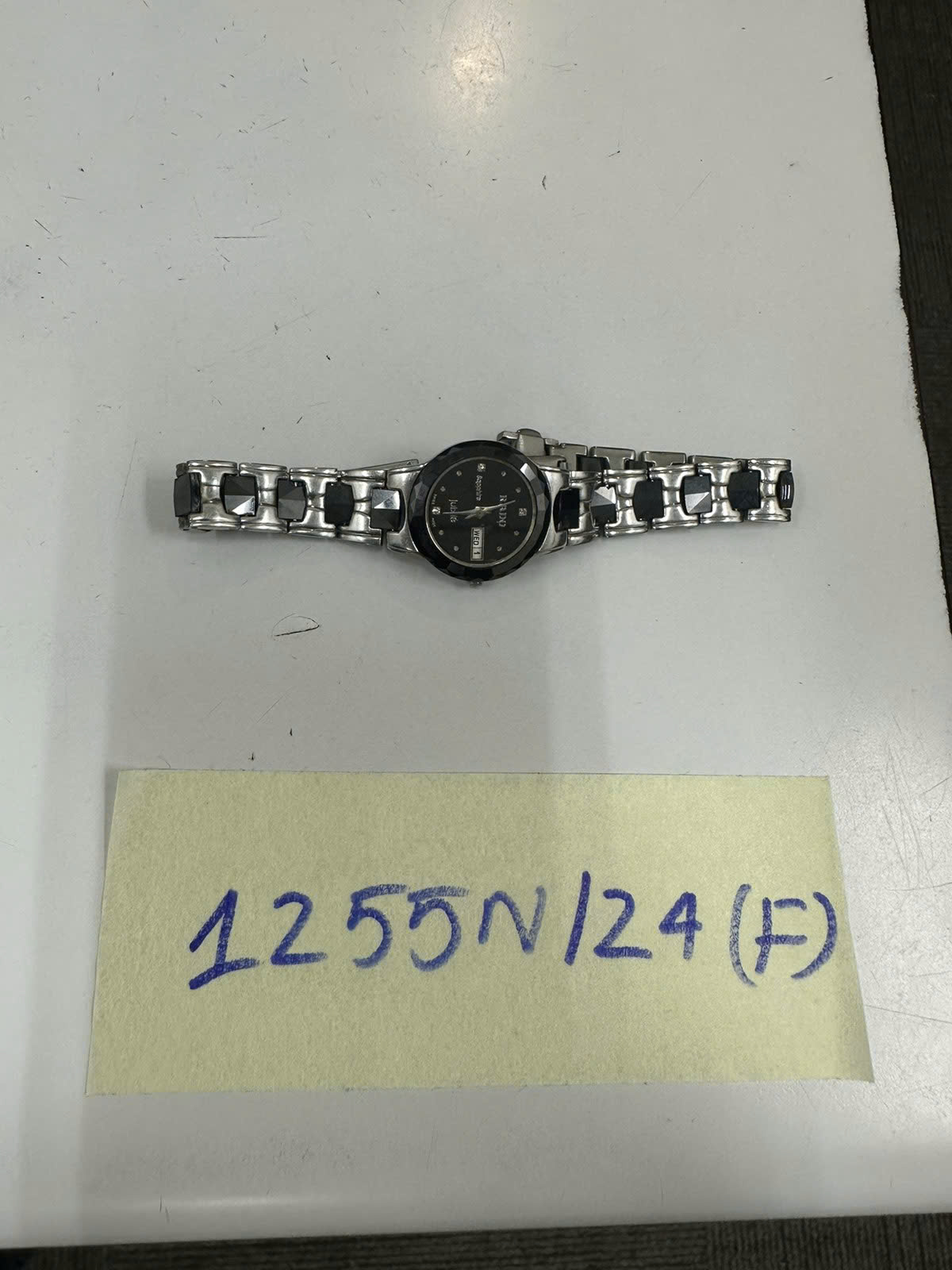 Ngày tiếp nhận: 31/7/2024 Mã hồ sơ: 1255N2024F Mô tả: 01 đồng hồ mặt tròn có dây bằng kim loại màu bạc và đen, trên mặt đồng hồ có chữ "RADO". |