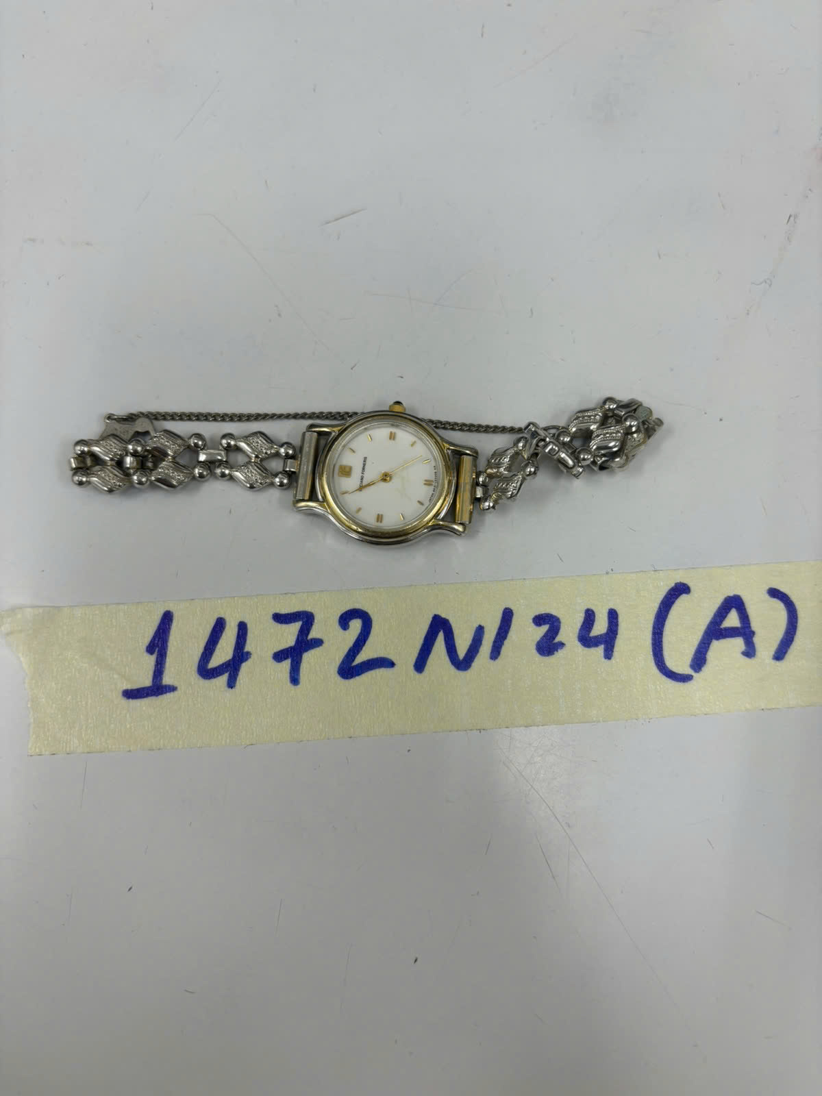 Ngày tiếp nhận: 31/8/2024 Mã hồ sơ: 1472N2024A Mô tả: 01 đồng hồ dây kim loại màu bạc, mặt tròn màu trắng ghi chữ LUCIANO FORNERIS. |