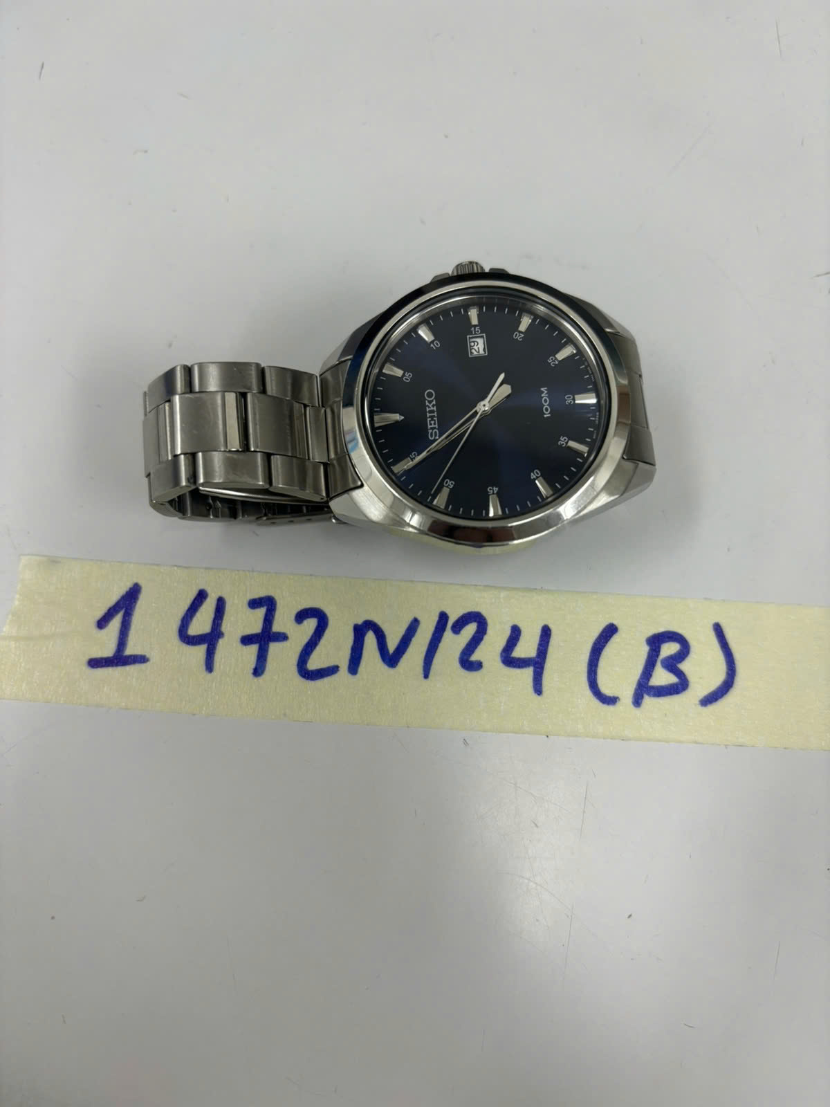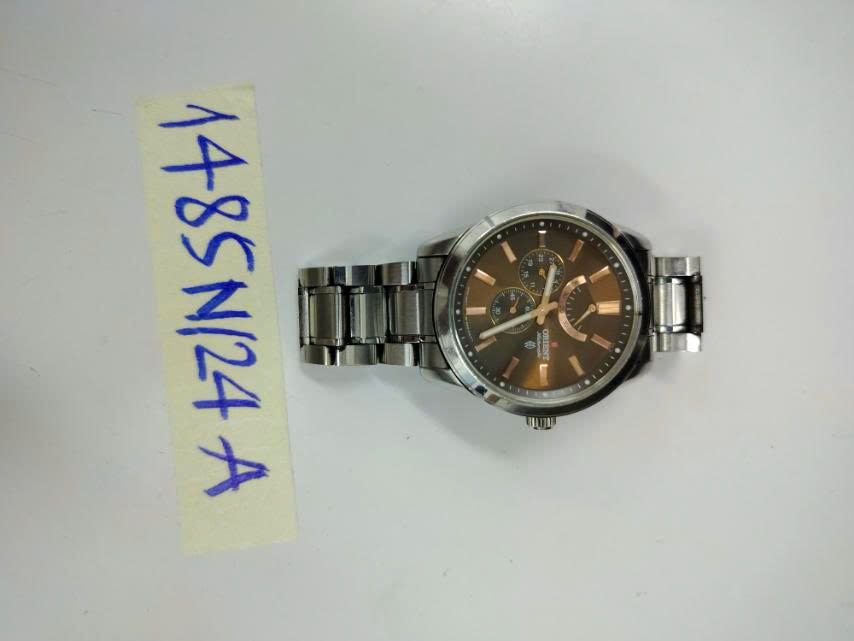 Ngày tiếp nhận: 31/8/2024 Mã hồ sơ: 1472N2024B Mô tả: 01 đồng hồ dây kim loại màu bạc, mặt tròn màu xanh ghi chữ SEIKO. |