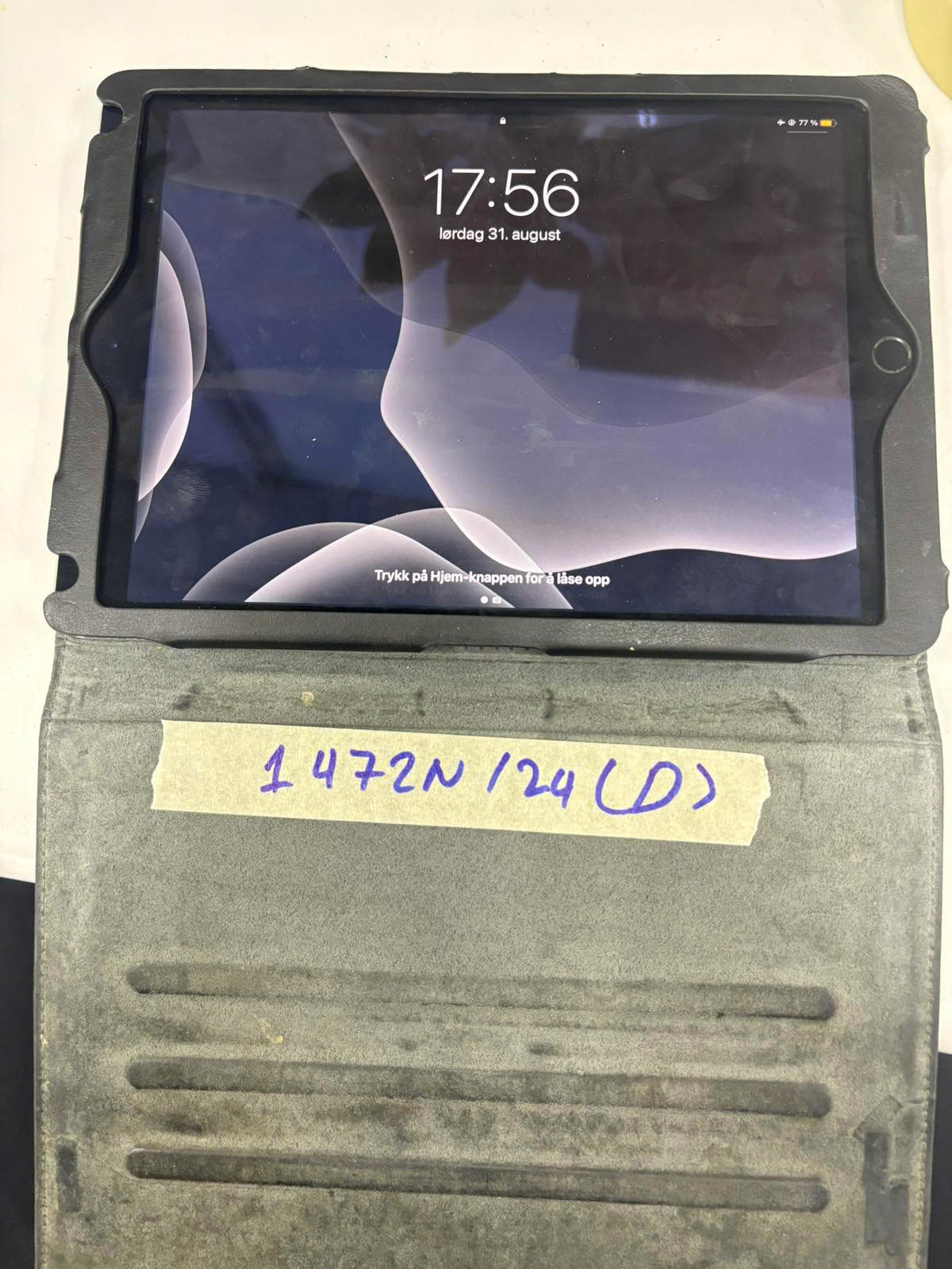 Ngày tiếp nhận: 31/8/2024 Mã hồ sơ: 1472N2024D Mô tả: 01 máy tính bảng hiệu APPLE màu xám có ốp bằng da màu đen có ghi chữ SANDSTREM. |