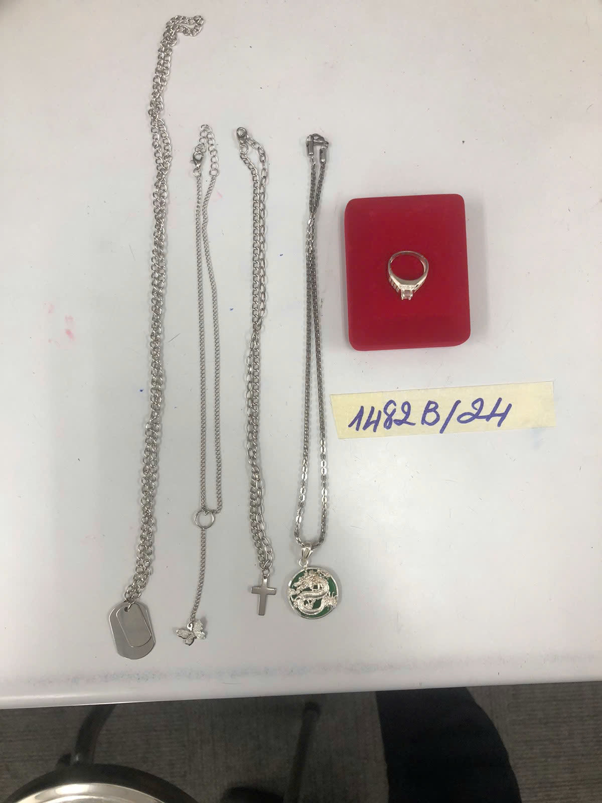 Ngày tiếp nhận: 02/9/2024 Mã hồ sơ: 1482N2024B Mô tả: 01 hộp trang sức màu đỏ gồm 01 nhẫn kim loại màu bạc có đính hạt, 04 dây chuyền kim loại màu bạc. |