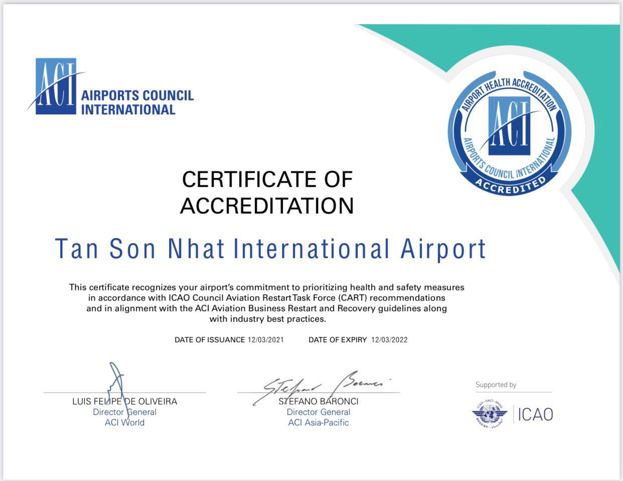 Ngày 26/11/2021, Cảng HKQT Tân Sơn Nhất đã vinh dự nhận được chứng nhận đảm bảo an toàn vệ sinh dịch tễ, phòng chống dịch bệnh Covid-19 (AHA) của Hiệp hội sân bay quốc tế (ACI) sau khi ACI xem xét đánh giá tất cả những biện pháp, quy trình, hướng dẫn công việc…mà Cảng đang triển khai liên quan đến vệ sinh dịch tễ, an toàn phòng chống dịch theo quy định của Nhà nước Việt Nam và các khuyến cáo của ACI khi CB-CNV và hành khách sử dụng cơ sở hạ tầng của Cảng. Chứng chỉ AHA có giá trị trong vòng 12 tháng kể từ ngày cấp.