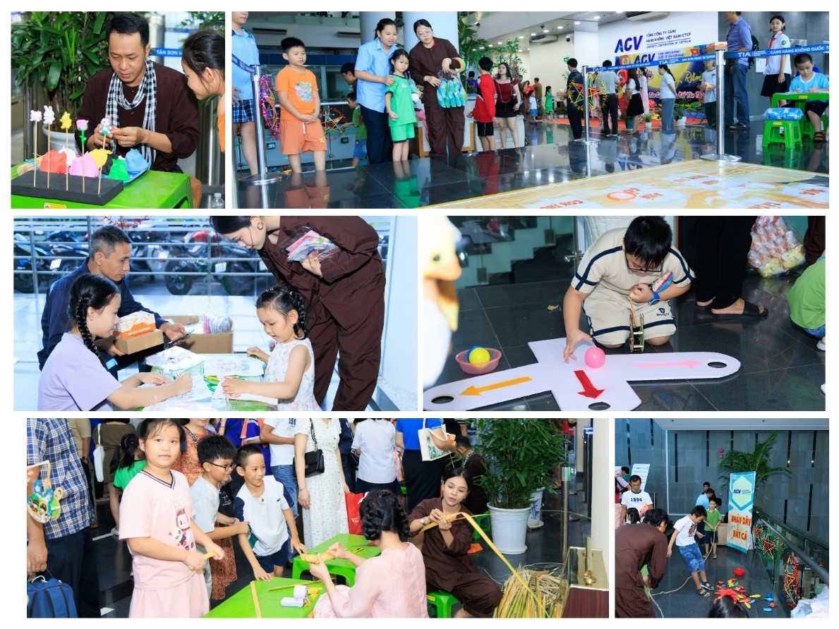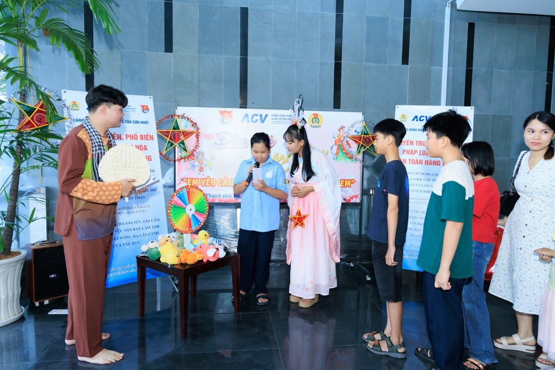 Chương trình đêm Hội được thực hiện theo hình thức các gian hàng trò chơi dân gian với nhiều phần thưởng vô cùng hấp dẫn tạo sự phấn khởi, thích thú cho các cháu thiếu nhi đến tham dự. Mỗi cháu thiếu nhi tham gia đêm Hội được tặng một set quà thú vị và ấm áp (bao gồm 01 phần ăn , 01 lồng đèn gỗ có logo ACV – Cảng HKQT Tân Sơn Nhất). Bên cạnh đó, Ban Chấp hành Đoàn Thanh niên Cảng đã lồng ghép nội dung tuyên truyền văn hóa an toàn hàng không thông qua gian hàng trò chơi “Vòng xoay kiến thức” với những câu hỏi đáp cơ bản phù hợp với lứa tuổi của các cháu thiếu nhi, góp phần nâng cao nhận thức và khơi dậy tinh thần học tập của các em thông qua quá trình vui chơi.