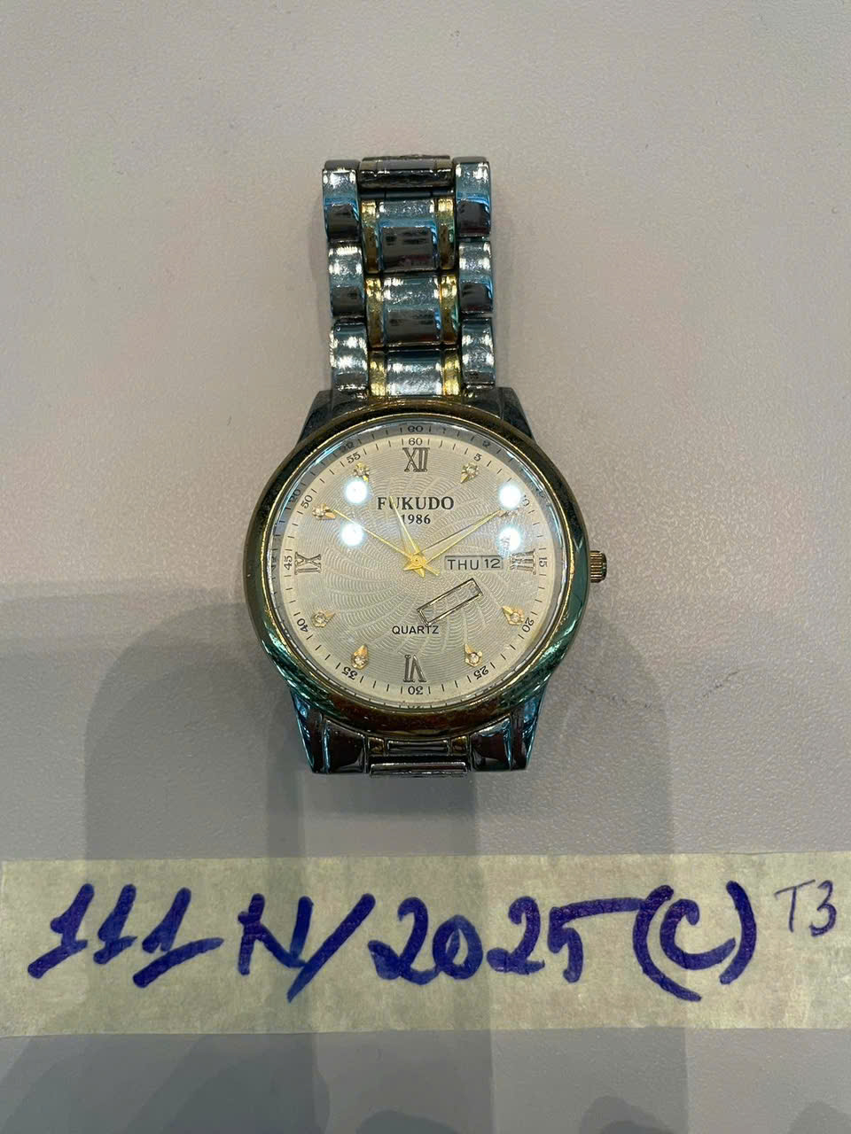 Ngày tiếp nhận: 02/12/2025 Mã hồ sơ: 111N2025C Mô tả: 01 đồng hồ FUKUDO nam cũ. |