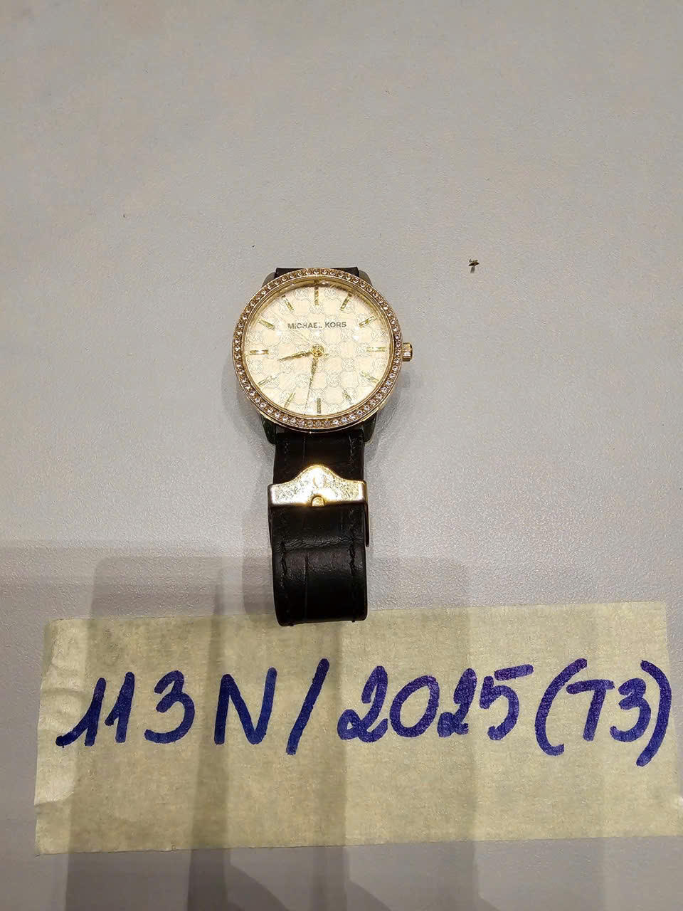 Ngày tiếp nhận: 02/12/2025 Mã hồ sơ: 113N2025 Mô tả: 01 đồng hồ dây da màu đe, mặt màu vàng hình tròn có chữ MICHEAL KORS. |