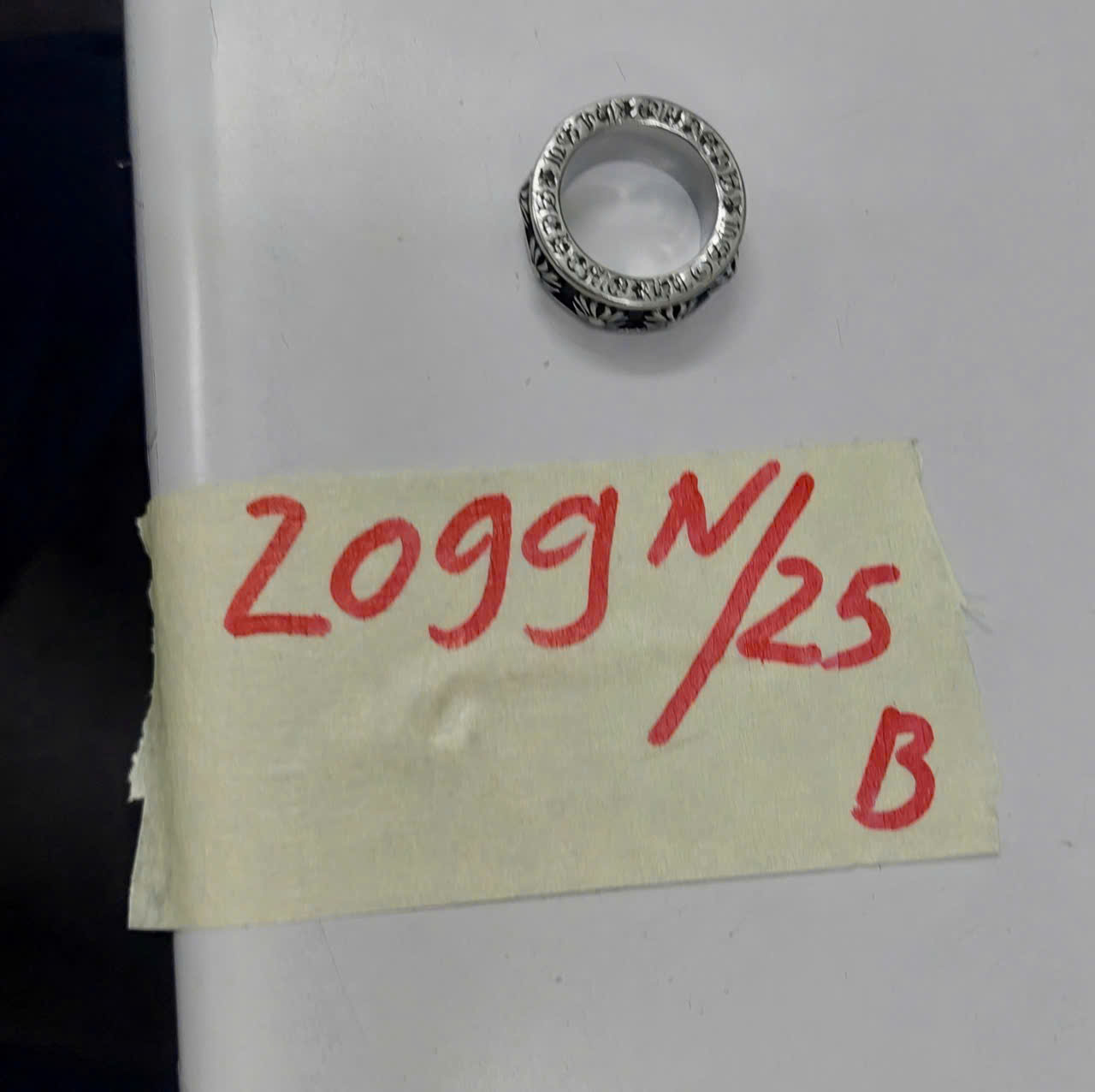 Ngày tiếp nhận: 02/12/2025 Mã hồ sơ: 2099N2025B Mô tả: 01 nhẫn kim loại màu bạc, không rõ hiệu. |