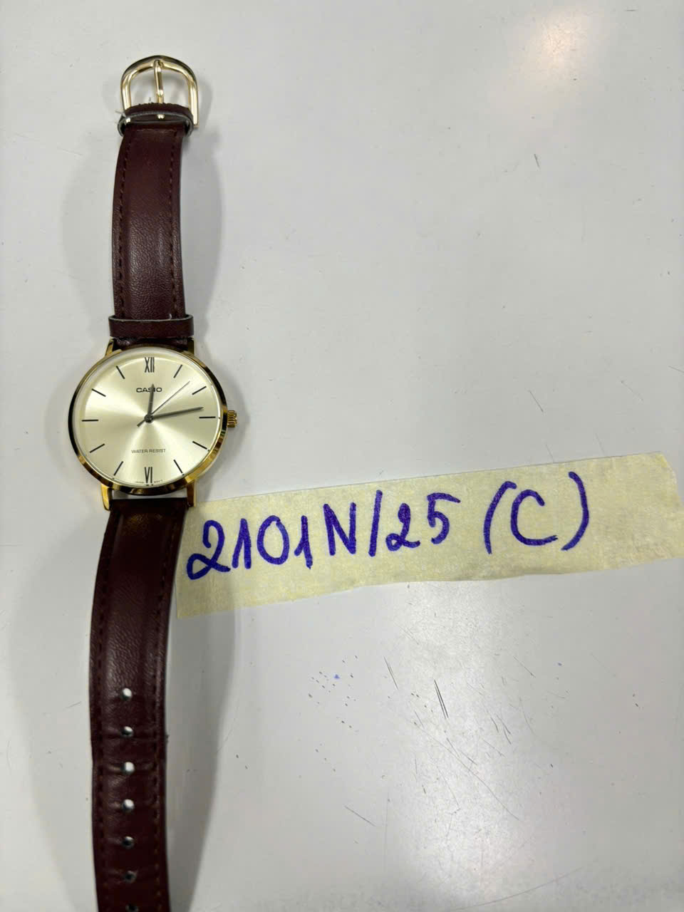 Ngày tiếp nhận: 02/12/2025 Mã hồ sơ: 2101N2025C Mô tả: 01 đồng hồ kim loại màu vàng, trên mặt có chữ CASIO, dây đeo màu nâu. |