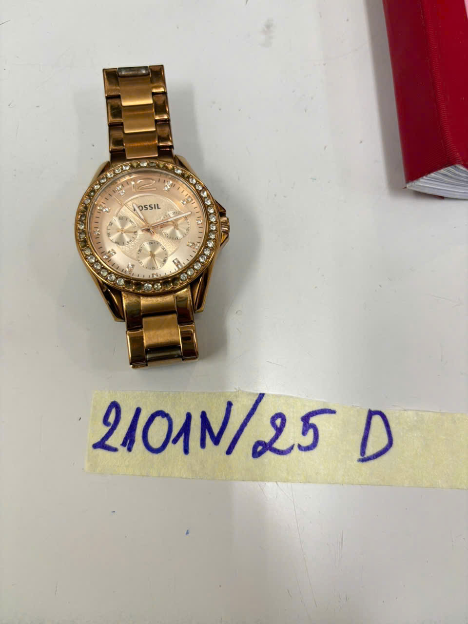 Ngày tiếp nhận: 02/12/2025 Mã hồ sơ: 2101N2025D Mô tả: 01 đồng hồ kim loại màu vàng đồng, trên mặt có chữ FOSSIL, kèm dây đeo bằng kim loại. |