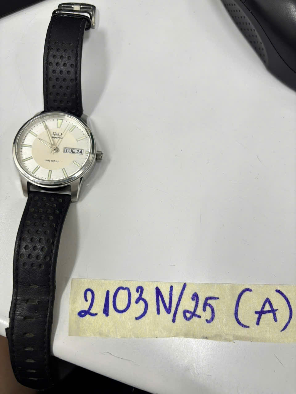 Ngày tiếp nhận: 02/12/2025 Mã hồ sơ: 2103N2025A Mô tả: 01 đồng hồ đeo tay, mặt hình tròn có logo chữ SUPERIOR, dây đeo bằng da màu đen. |