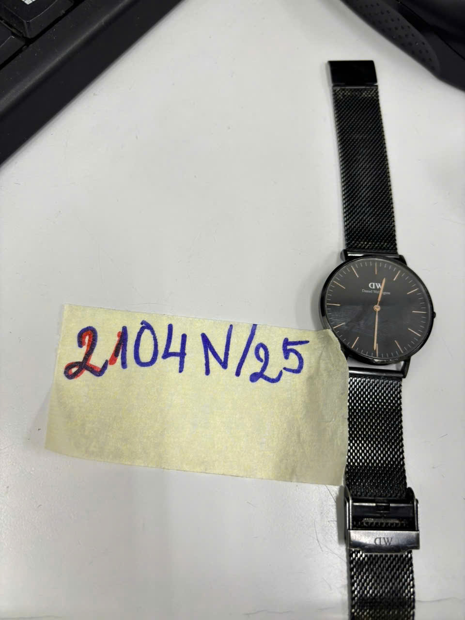 Ngày tiếp nhận: 02/12/2025 Mã hồ sơ: 2104N2025 Mô tả: 01 đồng hồ đeo tay mặt hình tròn, logo có chữ DANIEL WELLINTON, dây đeo kim loại màu đen. |
