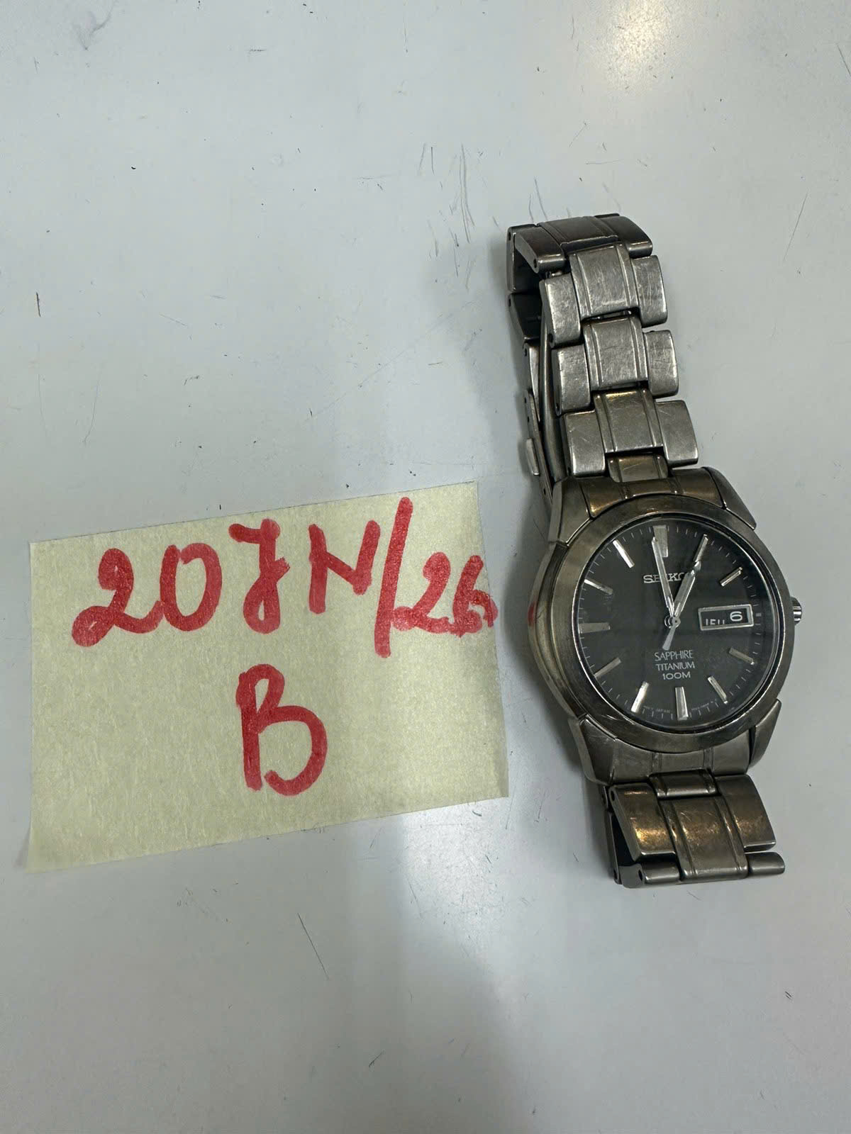 Ngày tiếp nhận: 05/02/2026 Mã hồ sơ: 207N2026B Mô tả: 01 đồng hồ đeo tay màu xám mặt tròn, có chữ SEIKO SAPHIRE TITANIUM. |