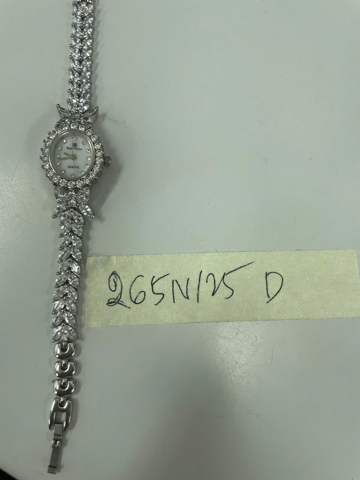 Ngày tiếp nhận: 07/02/2025 Mã hồ sơ: 265N2025D Mô tả: 01 đồng hồ bằng kim loại màu trắng, mặt có chữ ROYAL CROWN QUATZ, dây đeo và mặt đồng hồ có đính đá. |