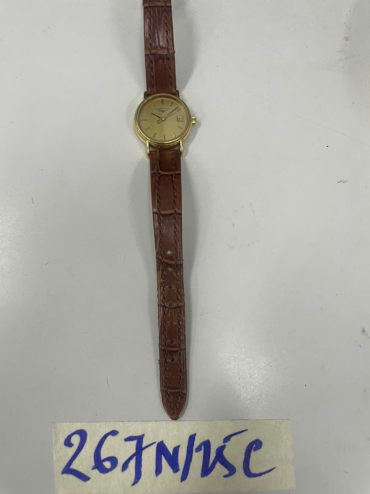 Ngày tiếp nhận: 07/02/2025 Mã hồ sơ: 267N2025C Mô tả: 01 đồng hồ mặt tròn có chữ "LONGINES" dây da nâu. |