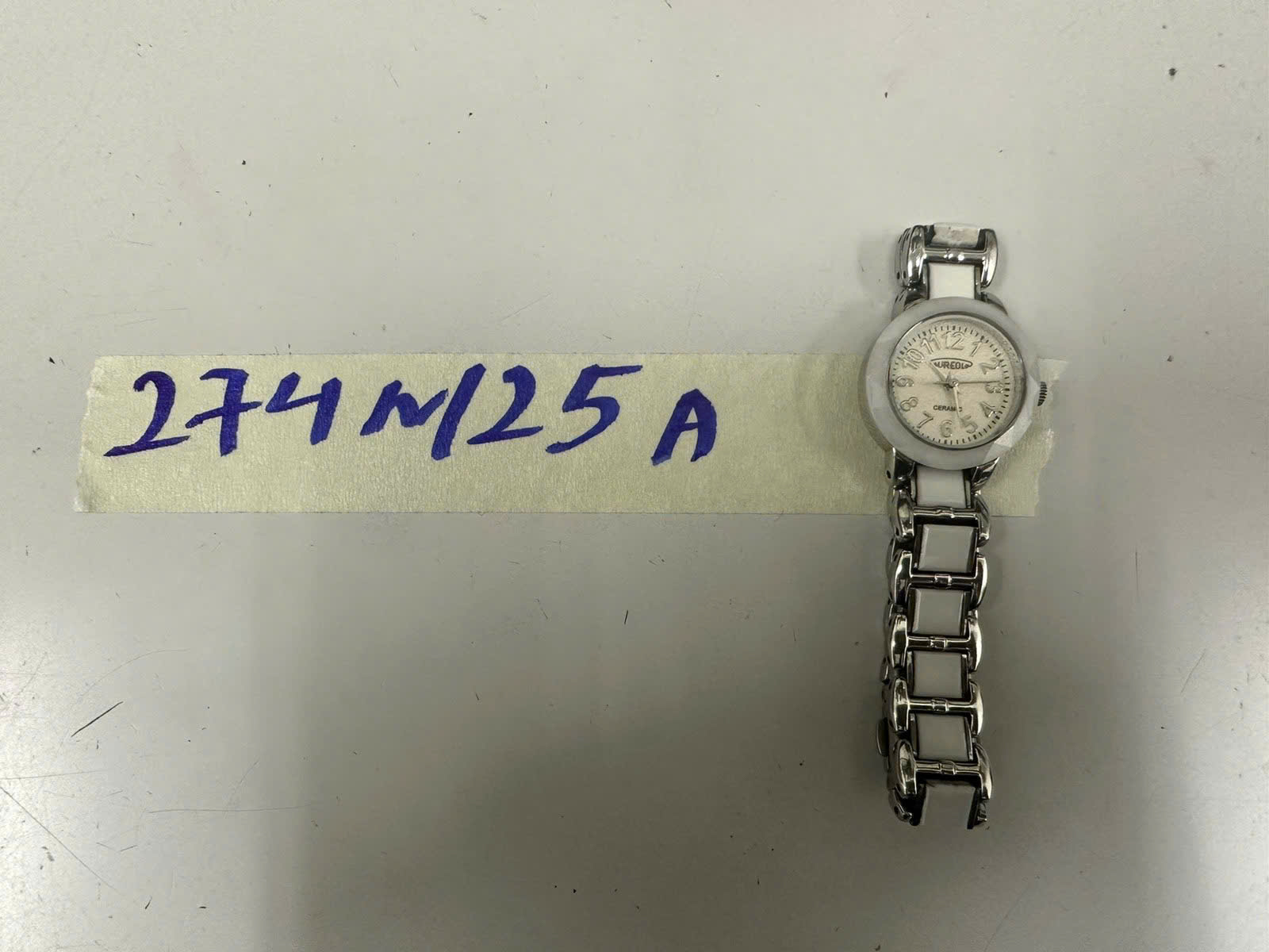 Ngày tiếp nhận: 07/02/2025 Mã hồ sơ: 274N2025A Mô tả: 01 Đồng hồ mặt tròn màu trắng, dây kim loại trắng, trên mặt có ghi chữ “AuREOL". |