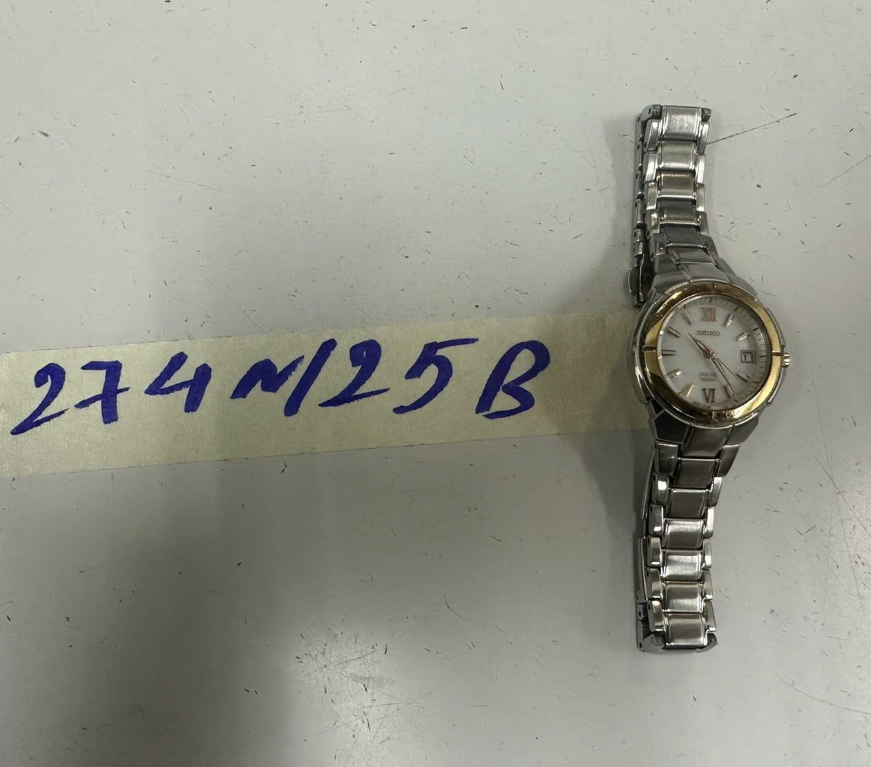 Ngày tiếp nhận: 07/02/2025 Mã hồ sơ: 274N2025B Mô tả: 01 Đồng hồ đeo tay nữ màu trắng bạc, trên mặt có ghi chữ "Seiko". |