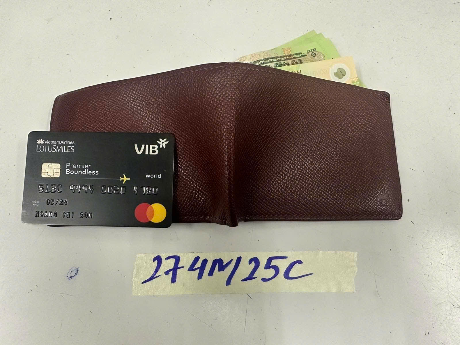 Ngày tiếp nhận: 07/02/2025 Mã hồ sơ: 274N2025C Mô tả: 01 ví da màu nâu có chữ "H.C.Son": 01 thẻ VIB Hoang Chi Son, 01 thẻ BIDV Hoang Chi Son, 2.909.000 VND (27 tờ 100.000 VND và 1 tờ 200.000 VND và 9000 VND). |