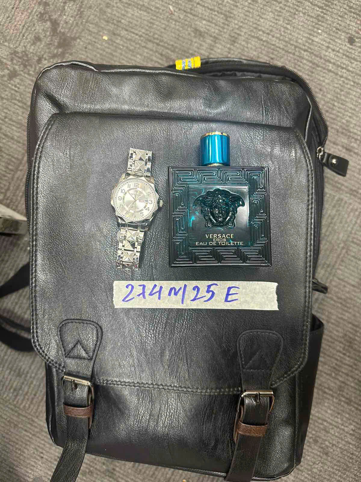 Ngày tiếp nhận: 07/02/2025 Mã hồ sơ: 274N2025E Mô tả: 01 Balo màu đen bên trong có đồ tư trang cá nhân và: + 01 chai nước hoa + 01 đồng hồ mặt và dây kim loại màu trắng trên mặt có chữ "BINBOND". |