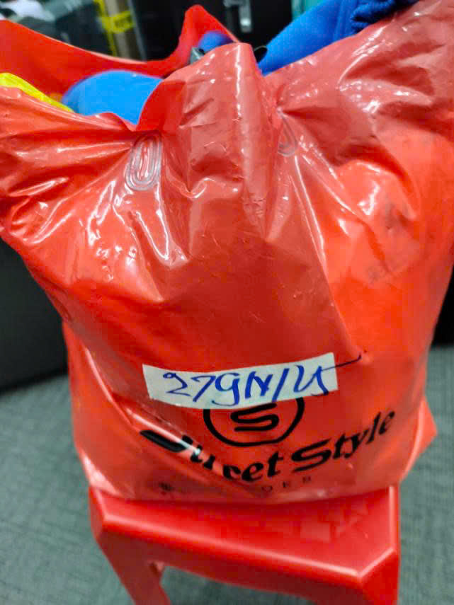 Ngày tiếp nhận: 08/02/2025 Mã hồ sơ: 279N2025 Mô tả: 01 túi nilong màu đỏ có quần áo cũ và thực phẩm qua sử dụng. |