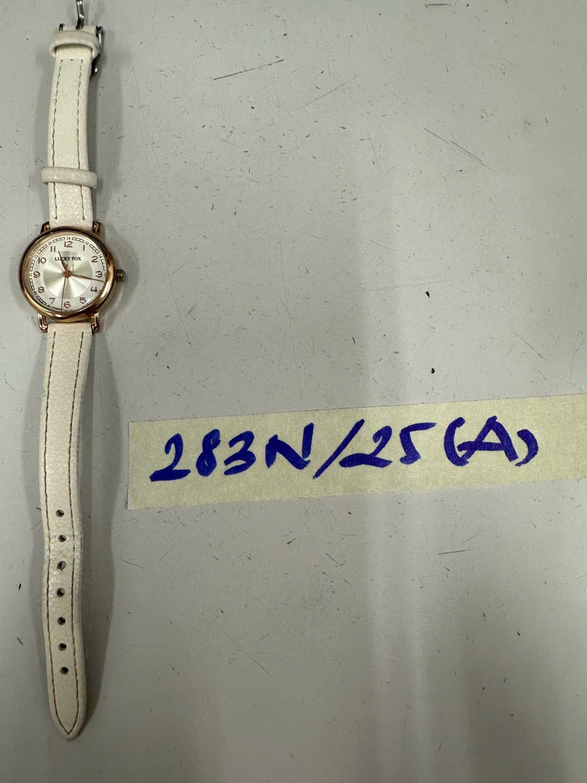 Ngày tiếp nhận: 09/02/2025 Mã hồ sơ: 283N2025A Mô tả: 01 đồng hồ dây da màu trắng mặt tròn, mặt đồng hồ có chữ "LUCKY FOX". |