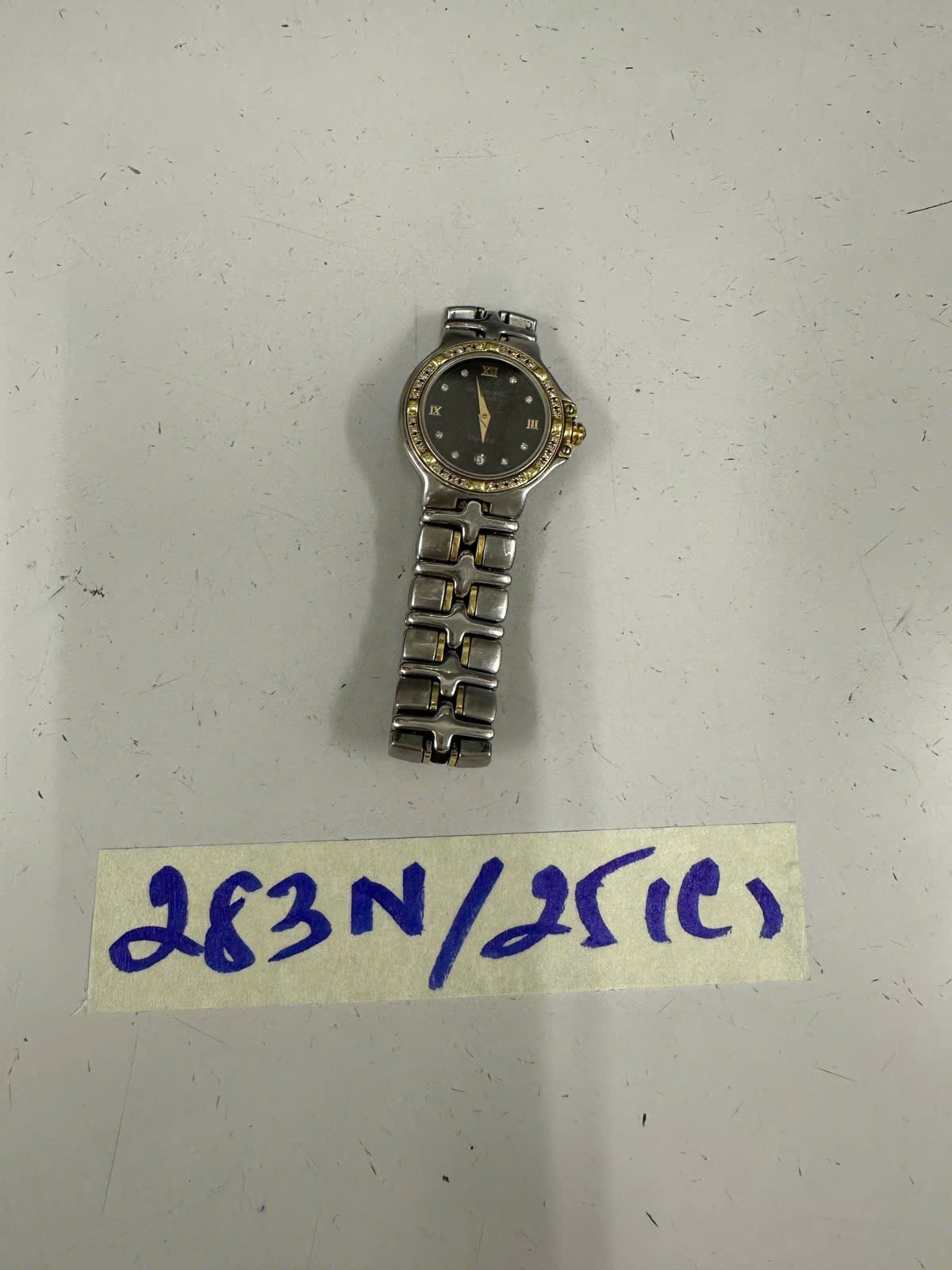 Ngày tiếp nhận: 09/02/2025 Mã hồ sơ: 283N2025C Mô tả: 01 đồng hô kim loại màu trắng mặt tròn, viền màu vàng, bên trong có chữ "RAYMOND WEIL". |