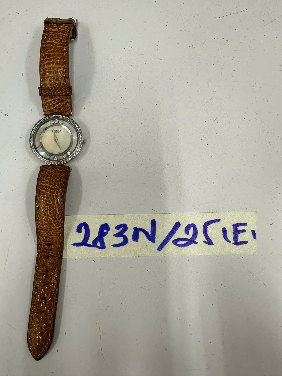 Ngày tiếp nhận: 09/02/2025 Mã hồ sơ: 283N2025E Mô tả: 01 đồng hồ dây da màu vàng, mặt tròn, có chữ "Chopard". |