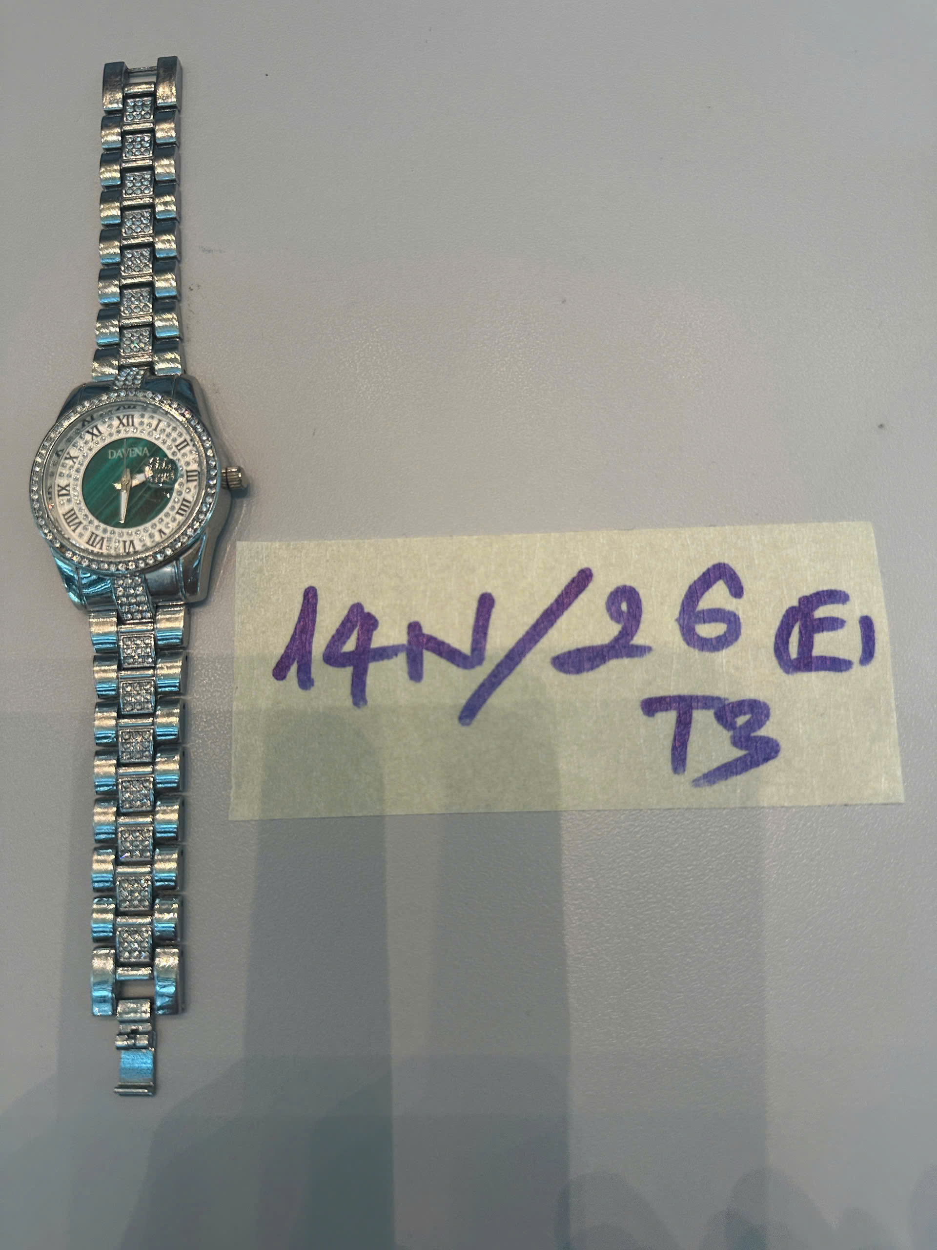 Ngày tiếp nhận: 10/01/2026 Mã hồ sơ: 14N2026E Mô tả: 01 đồng hồ kim loại dây màu trắng DAVENA. |