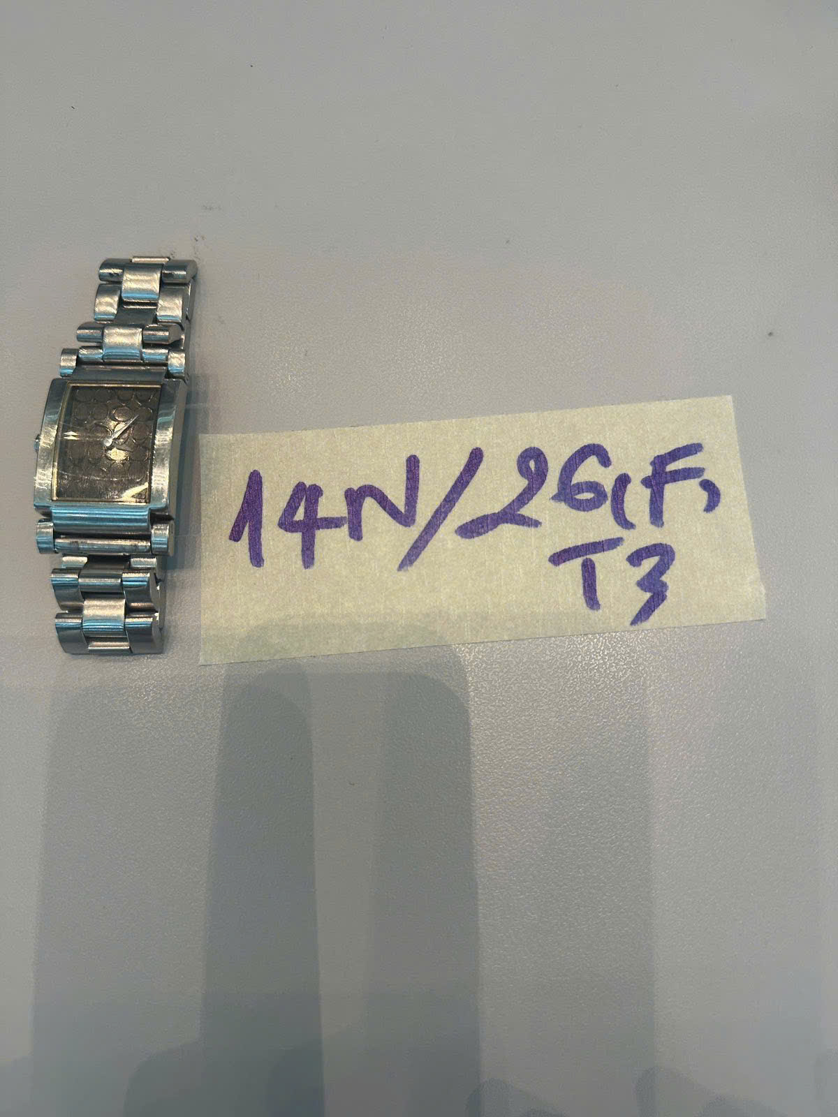 Ngày tiếp nhận: 10/01/2026 Mã hồ sơ: 14N2026F Mô tả: 01 đồng hồ kim loại màu trắng "Coach". |