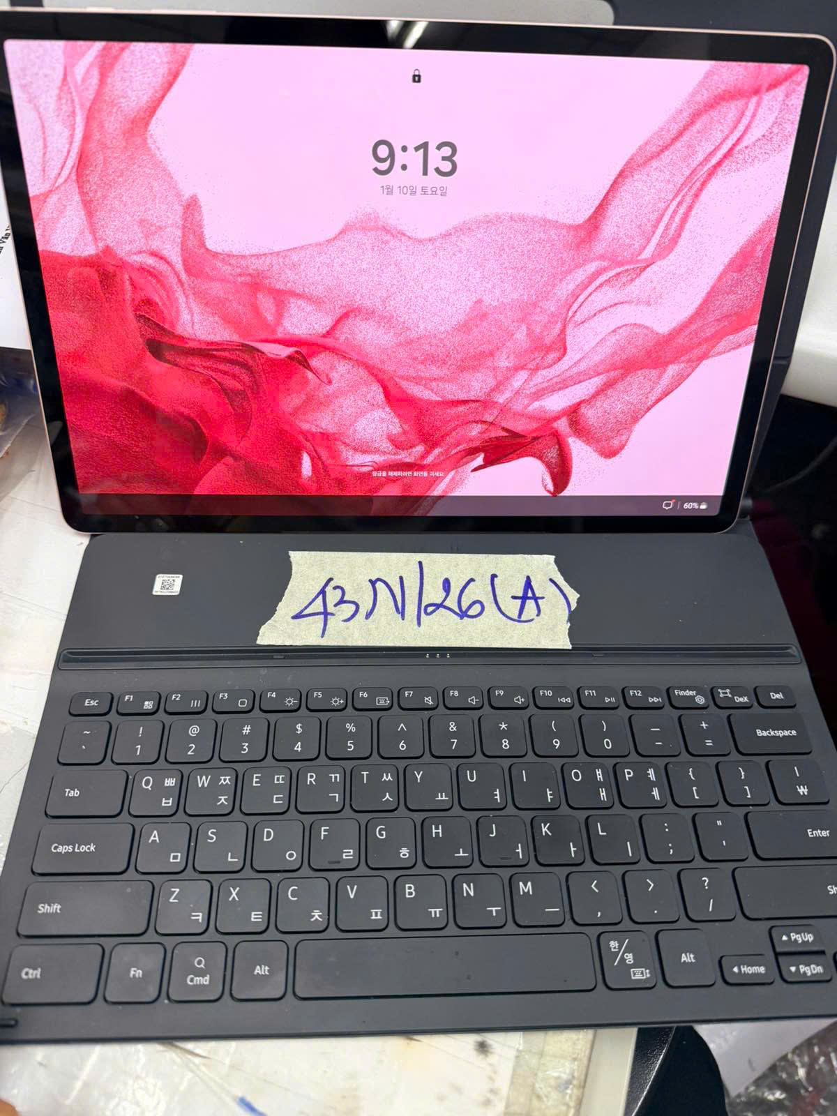 Ngày tiếp nhận: 10/01/2026 Mã hồ sơ: 43N2026A Mô tả: 01 máy tính bảng màu hồng "Samsung" kèm ốp bàn phím màu đen. |