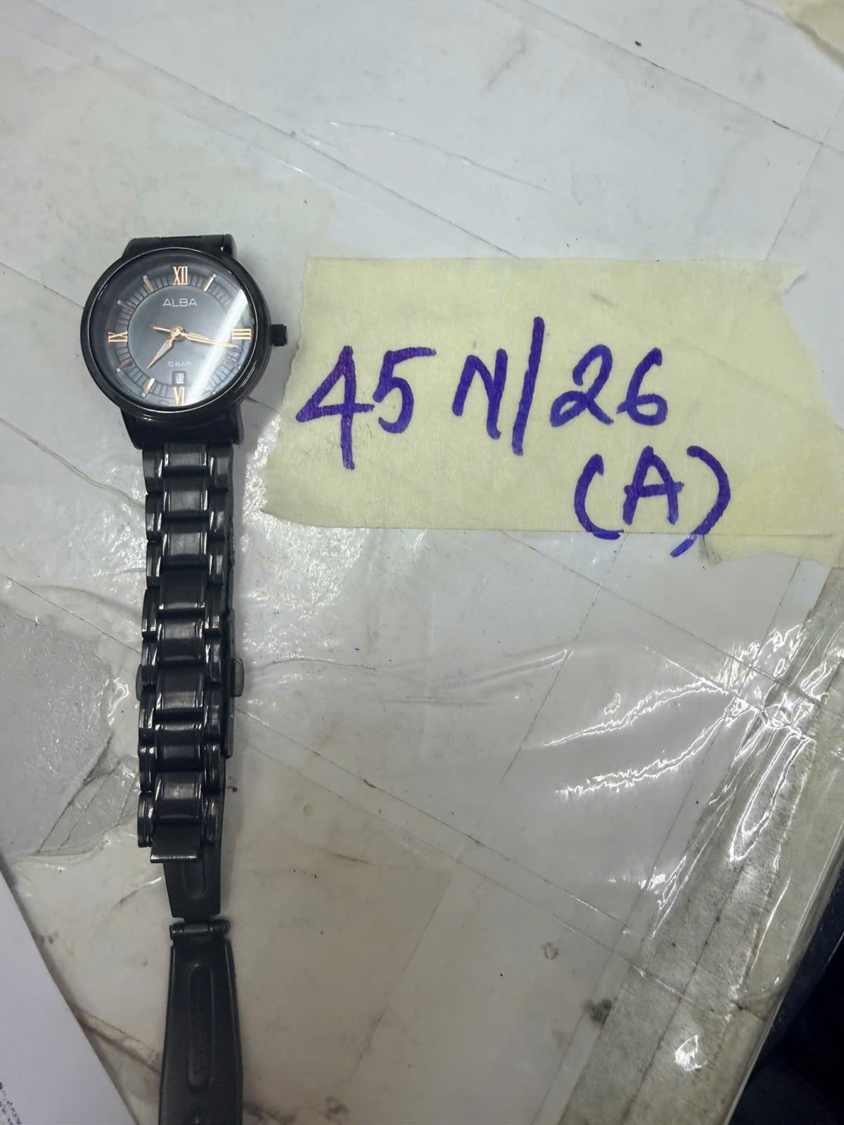 Ngày tiếp nhận: 10/01/2026 Mã hồ sơ: 45N2026A Mô tả: 01 đồng hồ kim loại màu đen ALBA dây kim loại đen. |