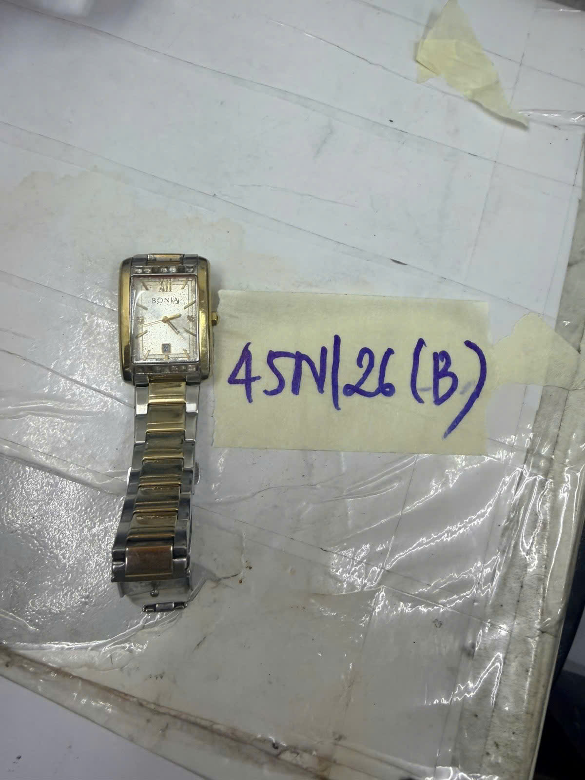 Ngày tiếp nhận: 10/01/2026 Mã hồ sơ: 45N2026B Mô tả: 01 đồng hồ kim loại màu trắng viền vàng "BONIA". |
