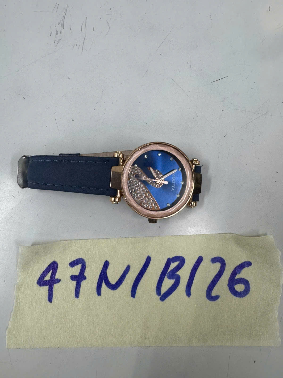 Ngày tiếp nhận: 10/01/2026 Mã hồ sơ: 47N2026B Mô tả: 01 đồng hồ màu màu vàng dây da xanh MODIYA. |