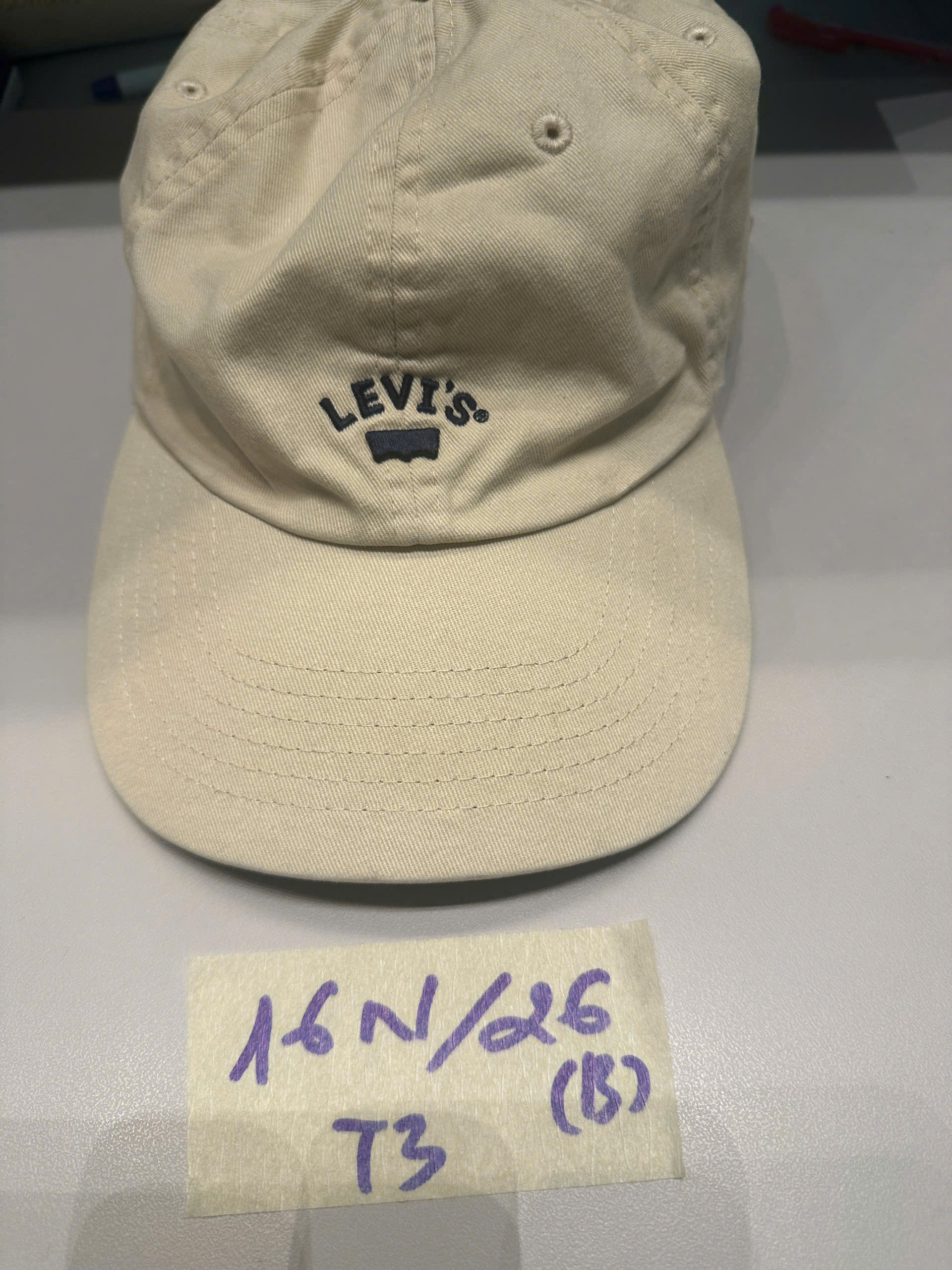Ngày tiếp nhận: 11/01/2026 Mã hồ sơ: 16N2026B-T3 Mô tả: 01 nón màu kem chữ LEVIS. |
