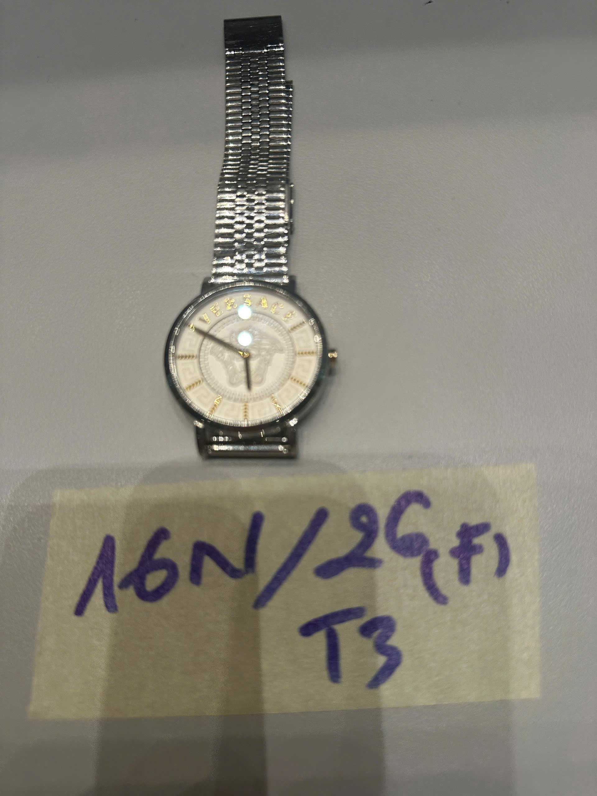 Ngày tiếp nhận: 11/01/2026 Mã hồ sơ: 16N2026F-T3 Mô tả: 01 đồng hồ mặt tròn dây kim loại trắng VERSACE. |