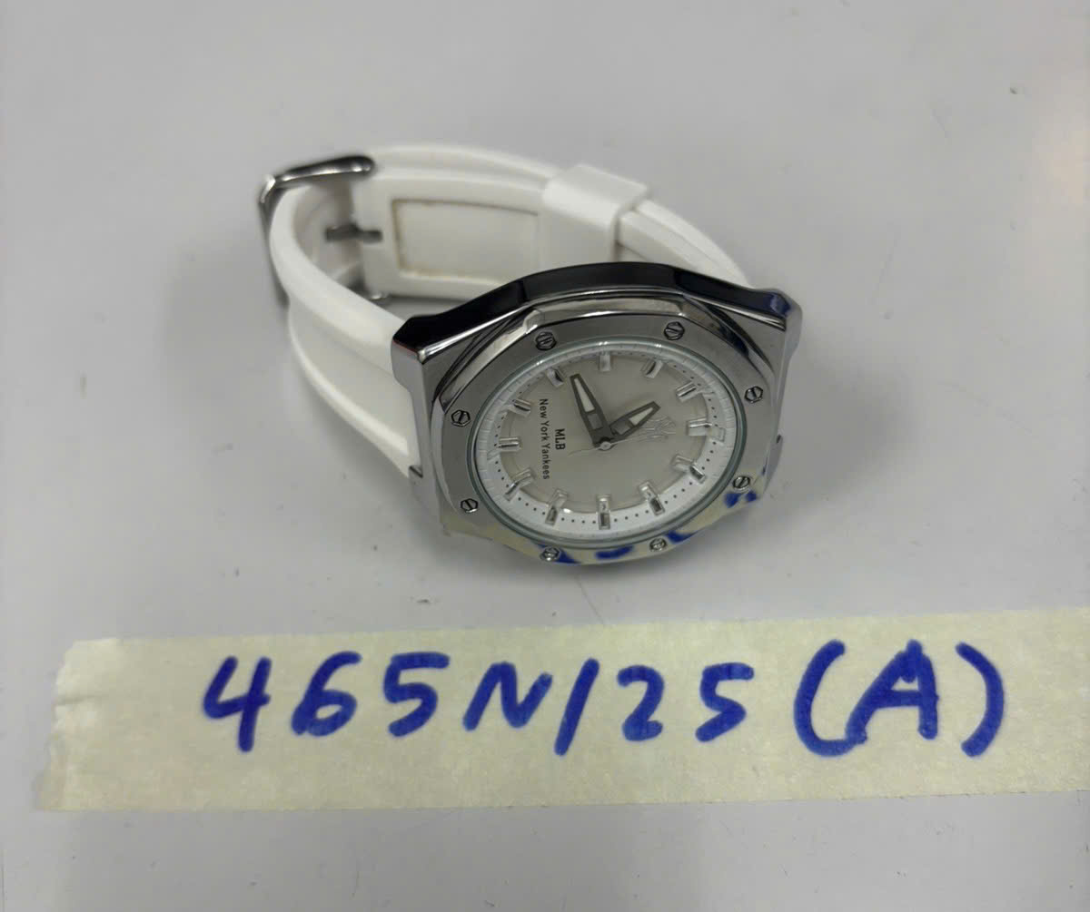 Ngày tiếp nhận: 10/03/2025 Mã hồ sơ: 465N2025A Mô tả: 01 đồng hồ mặt tròn màu trắng chữ MLB, dây đeo cao su trắng. |